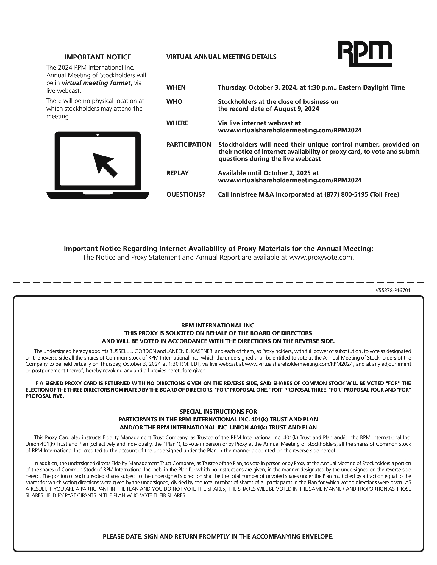 | | The Company will be hosting a virtual Annual Meeting. Stockholders will be able to participate in the Annual Meeting online, in virtual meeting format, via live webcast. Provided below is the summary of the information that you will need to participate in the Annual Meeting: • Stockholders can participate in the Annual Meeting online, in virtual meeting format, via live webcast over the Internet at www.virtualshareholdermeeting.com/RPM2024. • You will need your unique control number, which is provided on your notice of internet availability or proxy card, to vote and submit questions during the Annual Meeting webcast. • The webcast of the Annual Meeting will begin at 1:30 p.m., Eastern Daylight Time. • Instructions as to how to participate via the Internet, including how to verify stock ownership, are available at www.virtualshareholdermeeting.com/RPM2024. • If you have questions regarding how vote your shares of Common Stock, you may call Innisfree M&A Incorporated, at (877) 800-5195 (Toll Free). • Replay of the Annual Meeting webcast will be available until October 2, 2025. | |