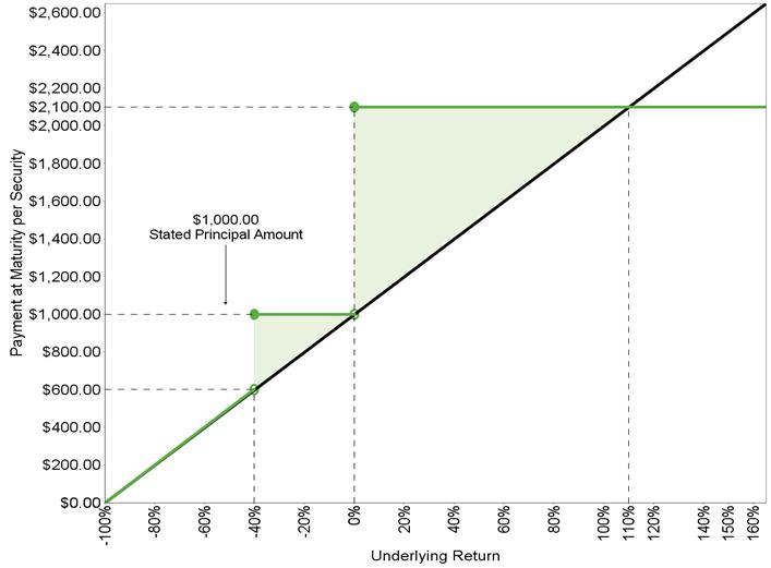 | ▪ | The securities offer the potential for automatic early redemption at a premium following the first valuation date (other than the final valuation date) on which the closing value of the underlying is greater than or equal to the initial underlying value. If the securities are not automatically redeemed prior to maturity, the securities will provide for (i) repayment of the stated principal amount plus a premium at maturity if the final underlying value is greater than or equal to the initial underlying value or (ii) repayment of the stated principal amount at maturity, with no premium, if the final underlying value is less than the initial underlying value but greater than or equal to the final barrier value specified below. However, if the securities are not automatically redeemed prior to maturity and the final underlying value is less than the final barrier value, you will lose 1% of the stated principal amount of your securities for every 1% by which the final underlying value is less than the initial underlying value. Although you will have downside exposure to the underlying, you will not receive dividends with respect to the underlying or participate in any appreciation of the underlying. |