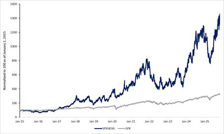 To illustrate the historical impact of the implicit financing cost on the performance of the S&P 500 Futures Excess Return Index, the following graph sets forth a comparison of the historical performance of the S&P 500 Futures Excess Return Index against the historical performance of the S&P 500® Index from January 2, 2015 through October 28, 2025, each normalized to have a closing value of 100.00 on January 2, 2015 to facilitate a comparison. The performance of the S&P 500® Index shown below is its price return performance – i.e., its performance without reflecting dividends. The total return performance of the S&P 500® Index (i.e., its performance reflecting dividends) would be greater than the price return performance shown below.