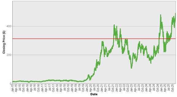 | Underlying Shares of Tesla, Inc. – Historical Closing Prices* January 2, 2015 to December 19, 2025 |