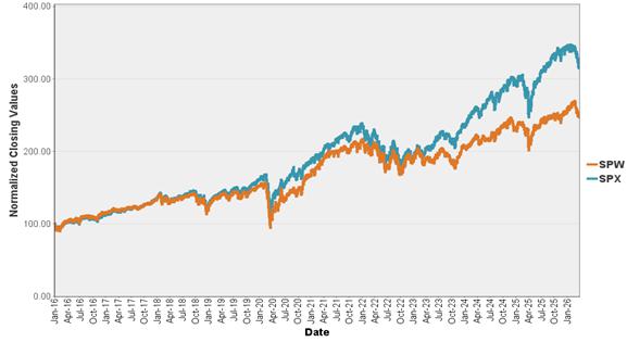 The following graph sets forth a comparison of the historical performance of the S&P 500® Equal Weight Index against the historical performance of the S&P 500® Index from January 4, 2016 through April 1, 2026, each normalized to have a closing value of 100.00 on January 4, 2016 to facilitate a comparison. In the graph below, references to “SPW” are to the S&P 500® Equal Weight Index and references to “SPX” are to the S&P 500® Index.