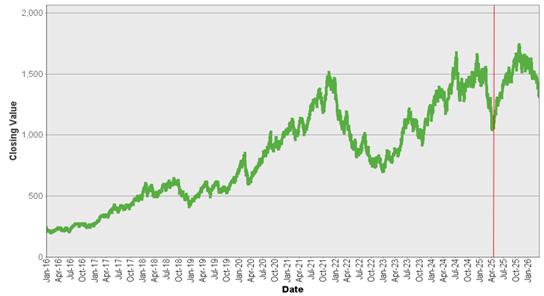 The closing value of the underlying on March 30, 2026 was 1,312.847. The graph below shows the hypothetical back-tested closing values of the underlying for the period from January 4, 2016 to April 25, 2025, and historical closing values of the underlying for the period April 28, 2025 to March 30, 2026. All data to the left of the vertical red line in the graph below are hypothetical and back-tested. We obtained the closing values from Bloomberg L.P., without independent verification. You should not take the hypothetical back-tested and historical values of the underlying as an indication of future performance.