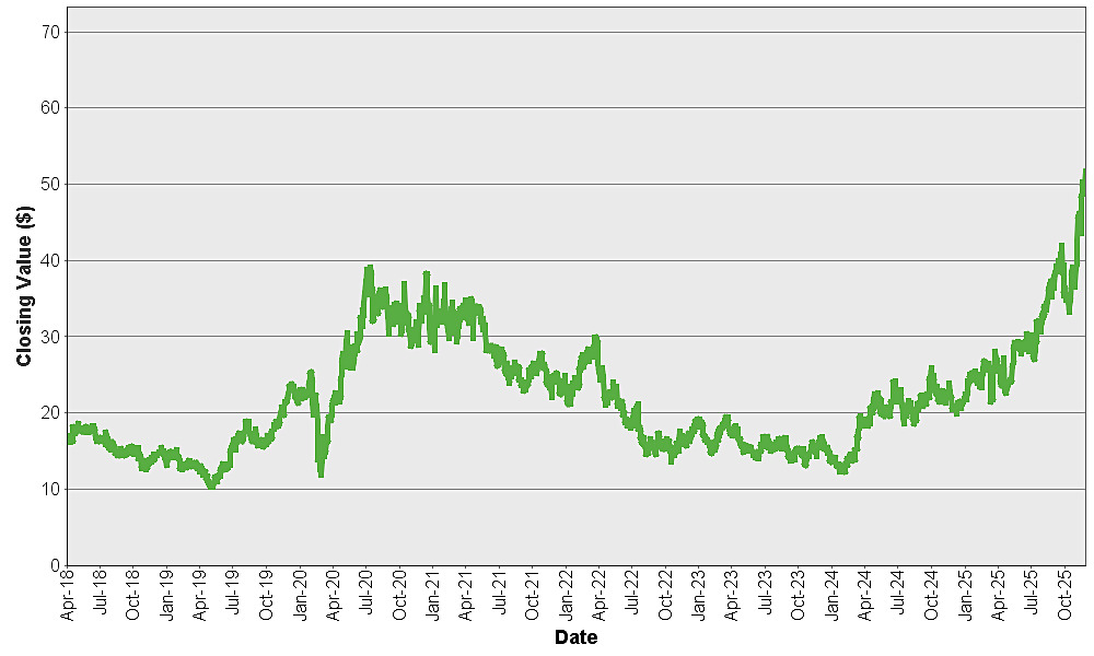 The graph below shows the closing value of Pan American Silver Corp. for each day such value was available from April 23, 2018 to December 19, 2025. We obtained the closing values from Bloomberg L.P., without independent verification. If certain corporate transactions occurred during the historical period shown below, including, but not limited to, spin-offs or mergers, then the closing values shown below for the period prior to the occurrence of any such transaction have been adjusted by Bloomberg L.P. as if any such transaction had occurred prior to the first day in the period shown below. You should not take historical closing values as an indication of future performance.
