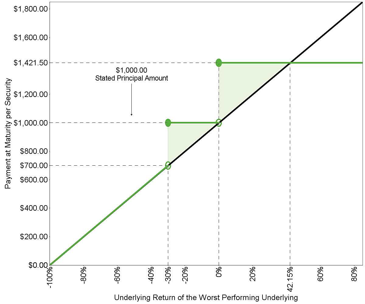 The diagram below illustrates your payment at maturity of the securities, assuming the securities have not previously been automatically redeemed, for a range of hypothetical underlying returns of the worst performing underlying on the final valuation date. Your payment at maturity (if the securities are not earlier automatically redeemed) will be determined based solely on the performance of the worst performing underlying on the final valuation date.