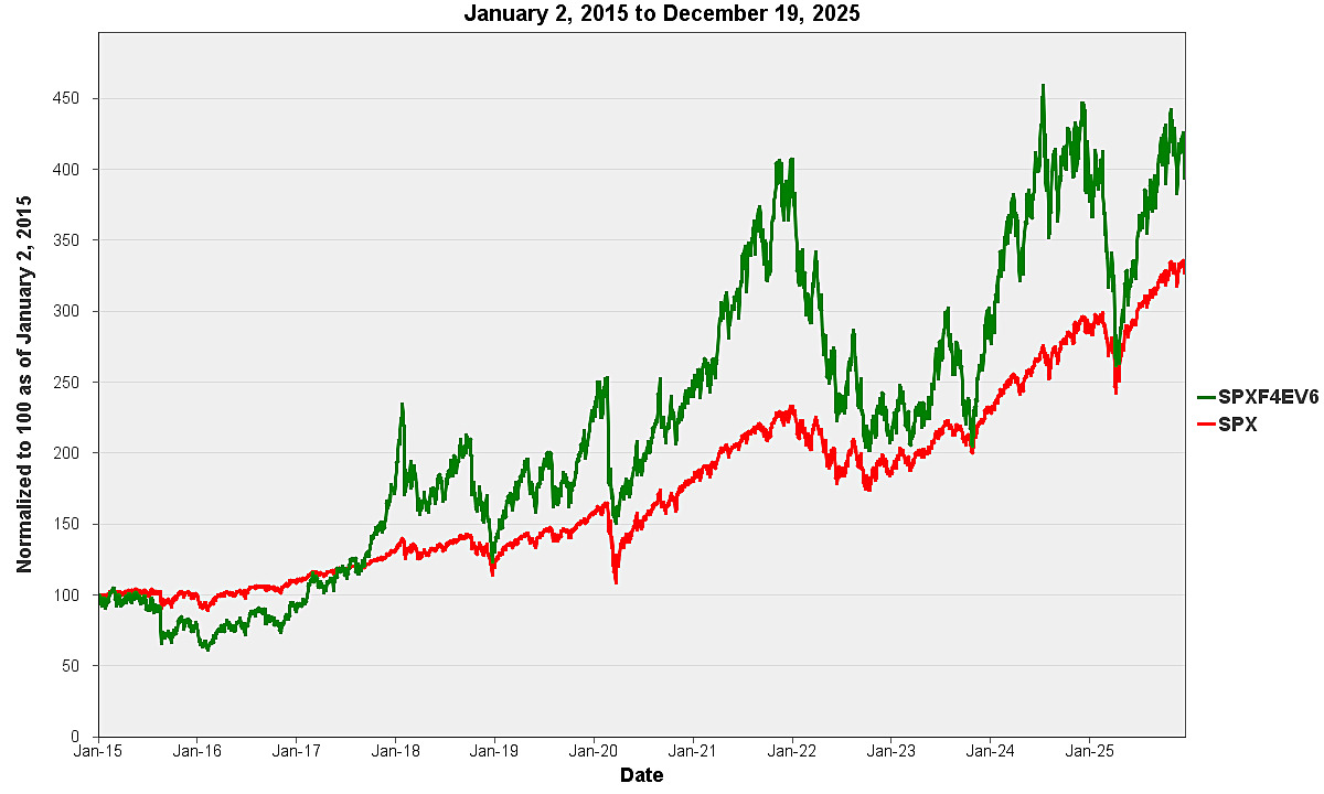 The following graphs set forth a comparison of the hypothetical back-tested and historical performance of the S&P 500 Futures 40% Edge Volatility 6% Decrement Index (USD) ER against the historical performance of the S&P 500® Index. The first graph shows comparative performance data for the period from January 2, 2015 through December 19, 2025, each normalized to have a closing value of 100.00 on January 2, 2015 to facilitate a comparison. The second graph shows comparative performance data for the period from January 3, 2022 through December 19, 2025, each normalized to have a closing value of 100.00 on January 3, 2022 to facilitate a comparison. The performance of the S&P 500® Index shown below is its price return performance – i.e., its performance without reflecting dividends. The total return performance of the S&P 500® Index (i.e., its performance reflecting dividends) would be greater than the price return performance shown below.All S&P 500 Futures 40% Edge Volatility 6% Decrement Index (USD) ER performance information prior to May 10, 2024 is hypothetical and back-tested, as the S&P 500 Futures 40% Edge Volatility 6% Decrement Index (USD) ER did not exist prior to that date. Hypothetical back-tested performance information is subject to the significant limitations described above under “Information About the S&P 500 Futures 40% Edge Volatility 6% Decrement Index (USD) ER”.