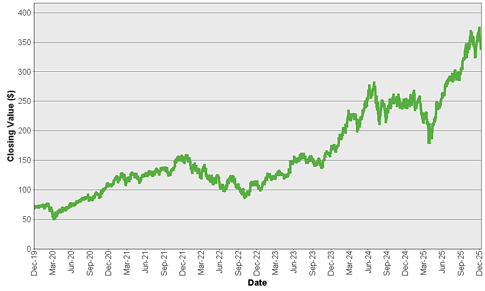 The graph below shows the closing value of the VanEck® Semiconductor ETF for each day such value was available from December 11, 2019 to December 19, 2025. We obtained the closing values from Bloomberg L.P., without independent verification. You should not take historical closing values as an indication of future performance.