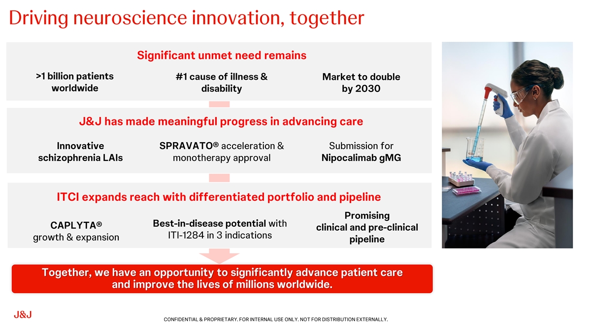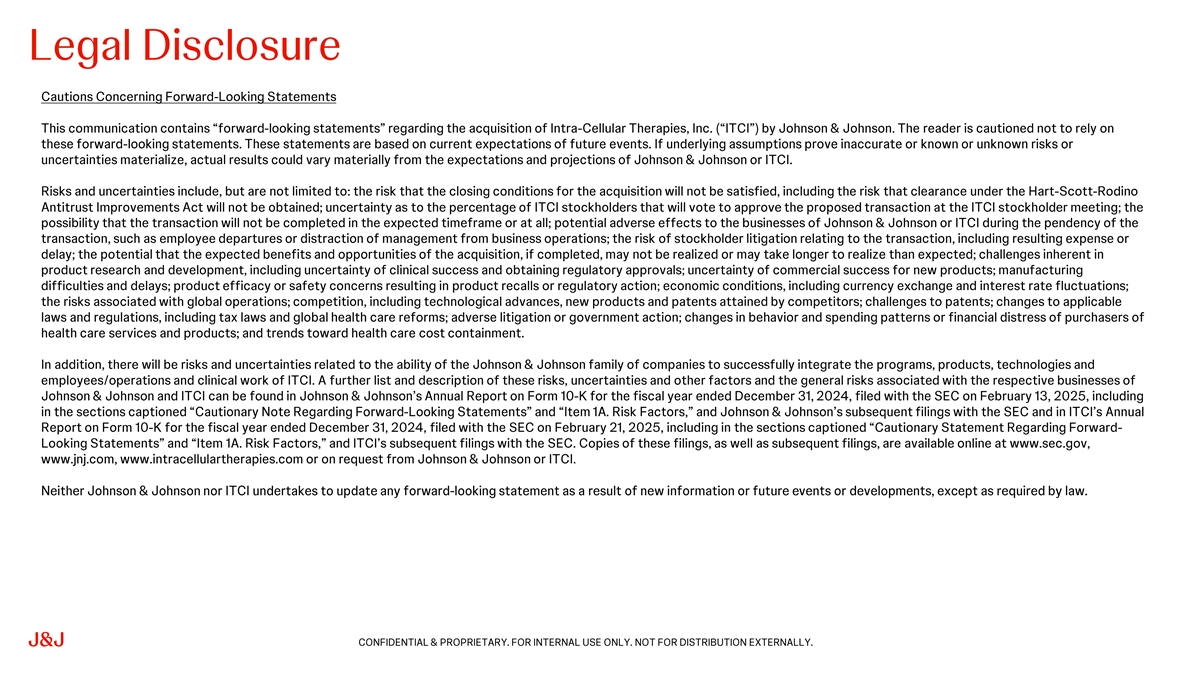 This communication contains “forward-looking statements” regarding the acquisition of Intra-Cellular Therapies, Inc. (“ITCI”) by Johnson & Johnson. The reader is cautioned not to rely on these forward-looking statements. These statements are based on current expectations of future events. If underlying assumptions prove inaccurate or known or unknown risks or uncertainties materialize, actual results could vary materially from the expectations and projections of Johnson & Johnson or ITCI.