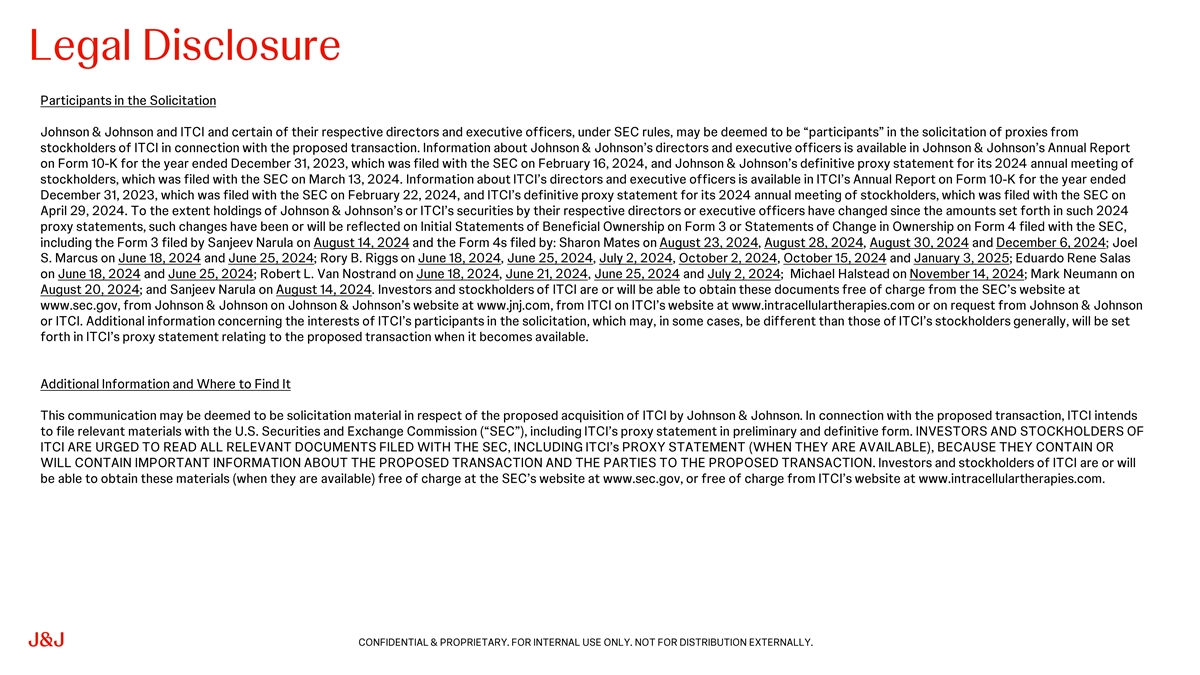 Johnson & Johnson and ITCI and certain of their respective directors and executive officers, under SEC rules, may be deemed to be “participants” in the solicitation of proxies from stockholders of ITCI in connection with the proposed transaction. Information about Johnson & Johnson’s directors and executive officers is available in Johnson & Johnson’s Annual Report on Form 10-K for the year ended December 31, 2023, which was filed with the SEC on February 16, 2024, and Johnson & Johnson’s definitive proxy statement for its 2024 annual meeting of stockholders, which was filed with the SEC on March 13, 2024. Information about ITCI’s directors and executive officers is available in ITCI’s Annual Report on Form 10-K for the year ended December 31, 2023, which was filed with the SEC on February 22, 2024, and ITCI’s definitive proxy statement for its 2024 annual meeting of stockholders, which was filed with the SEC on April 29, 2024. To the extent holdings of Johnson & Johnson’s or ITCI’s securities by their respective directors or executive officers have changed since the amounts set forth in such 2024 proxy statements, such changes have been or will be reflected on Initial Statements of Beneficial Ownership on Form 3 or Statements of Change in Ownership on Form 4 filed with the SEC, including the Form 3 filed by Sanjeev Narula on August 14, 2024 and the Form 4s filed by: Sharon Mates on August 23, 2024, August 28, 2024, August 30, 2024 and December 6, 2024; Joel S. Marcus on June 18, 2024 and June 25, 2024; Rory B. Riggs on June 18, 2024, June 25, 2024, July 2, 2024, October 2, 2024, October 15, 2024 and January 3, 2025; Eduardo Rene Salas on June 18, 2024 and June 25, 2024; Robert L. Van Nostrand on June 18, 2024, June 21, 2024, June 25, 2024 and July 2, 2024; Michael Halstead on November 14, 2024; Mark Neumann on August 20, 2024; and Sanjeev Narula on August 14, 2024. Investors and stockholders of ITCI are or will be able to obtain these documents free of charge from the SEC’s website at www.sec.gov, from Johnson & Johnson on Johnson & Johnson’s website at www.jnj.com, from ITCI on ITCI’s website at www.intracellulartherapies.com or on request from Johnson & Johnson or ITCI. Additional information concerning the interests of ITCI’s participants in the solicitation, which may, in some cases be different than those of ITCI’s stockholders generally, is included in ITCI’s definitive proxy statement relating to the proposed transaction, which was filed with the SEC on February 18, 2025.