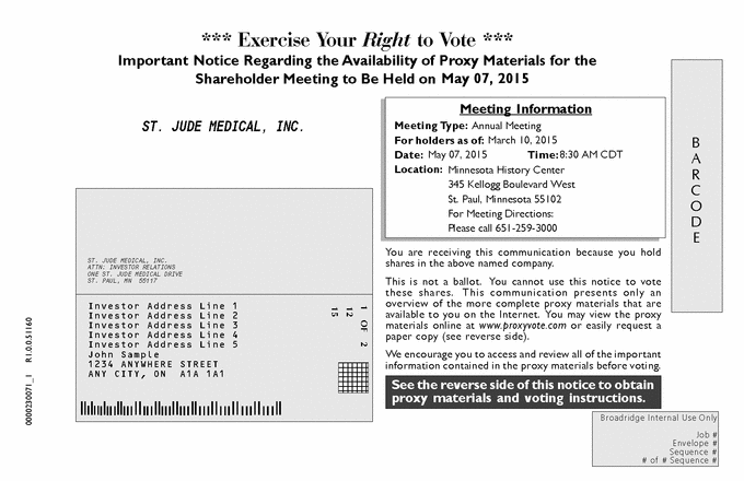 BARCODE 1 OF 2 12 15 1234567 1234567 1234567 1234567 1234567 1234567 1234567 See the reverse side of this notice to obtain proxy materials and voting instructions. Broadridge Internal Use Only Job # Envelope # Sequence # # of # Sequence # *** Exercise Your Right to Vote *** Important Notice Regarding the Availability of Proxy Materials for the Shareholder Meeting to Be Held on. You are receiving this communication because you hold shares in the above named company. This is not a ballot. You cannot use this notice to vote these shares. This communication presents only an overview of the more complete proxy materials that are available to you on the Internet. You may view the proxy materials online at www.proxyvote.com or easily request a paper copy (see reverse side). We encourage you to access and review all of the important information contained in the proxy materials before voting. Meeting Information Meeting Type: For holders as of: Date: Time: Location: 0000230071_1 R1.0.0.51160 ST. JUDE MEDICAL, INC. ST. JUDE MEDICAL, INC. ATTN: INVESTOR RELATIONS ONE ST. JUDE MEDICAL DRIVE ST. PAUL, MN 55117 Investor Address Line 1 Investor Address Line 2 Investor Address Line 3 Investor Address Line 4 Investor Address Line 5 John Sample 1234 ANYWHERE STREET ANY CITY, ON A1A 1A1 Annual Meeting March 10, 2015 May 07, 2015 May 07, 2015 8:30 AM CDT Minnesota History Center 345 Kellogg Boulevard West St. Paul, Minnesota 55102 For Meeting Directions: Please call 651-259-3000 |