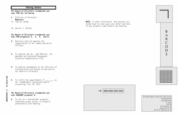 BARCODE 123456789012 123456789012 123456789012 123456789012 123456789012 123456789012 123456789012 123456789012 123456789012 123456789012 123456789012 123456789012 Broadridge Internal Use Only xxxxxxxxxx xxxxxxxxxx Cusip Job # Envelope # Sequence # # of # Sequence # Voting items 0000230071_3 R1.0.0.51160 The Board of Directors recommends you vote FOR the following: 1. Election of Directors Nominees 1a. John W. Brown 1b. Daniel J. Starks The Board of Directors recommends you vote FOR proposals 2, 3, 4, and 5: 2. Advisory vote to approve the compensation of our named executive officers. 3. To approve the St. Jude Medical, Inc. Amended and Restated Management Incentive Compensation Plan. 4. To approve amendments to our Articles of Incorporation and Bylaws to declassify our Board of Directors. 5 To ratify the appointment of as our independent registered public accounting firm for 2015. The Board of Directors recommends you vote AGAINST proposal 6: 6 To act on a shareholder proposal regarding proxy access if properly presented at the meeting. NOTE: In their discretion, the proxies are authorized to vote upon such other business as may properly come before the meeting. |