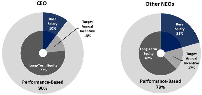 | • | 90% of our CEO’s total target compensation opportunity was performance-based, with 100% of his long-term incentive (equity) awards subject to performance-based vesting. |