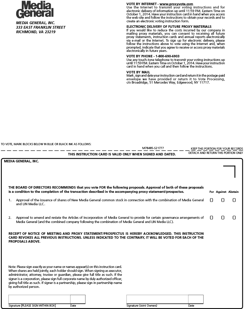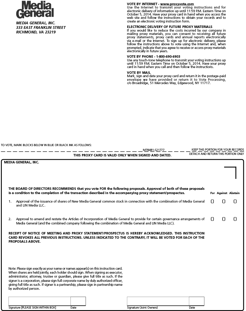 The special meetings of the shareholders of each of Media General and LIN, which were convened on August 20, 2014, and then adjourned before conducting any business, are scheduled to be reconvened on October 6, 2014, at the times and places described herein. The record date of July 18, 2014, for determining the Media General and LIN shareholders entitled to notice of and to vote at the special meetings on October 6, 2014, has not changed. Your vote is very important. If you have already delivered a properly executed proxy or submitted voting instructions and do not wish to change your vote, you do not need to do anything. If you have not previously voted or if you wish to revoke or change your vote, please complete and return the enclosed proxy card or, if you are a Media General shareholder, submit a proxy by telephone or via the Internet.