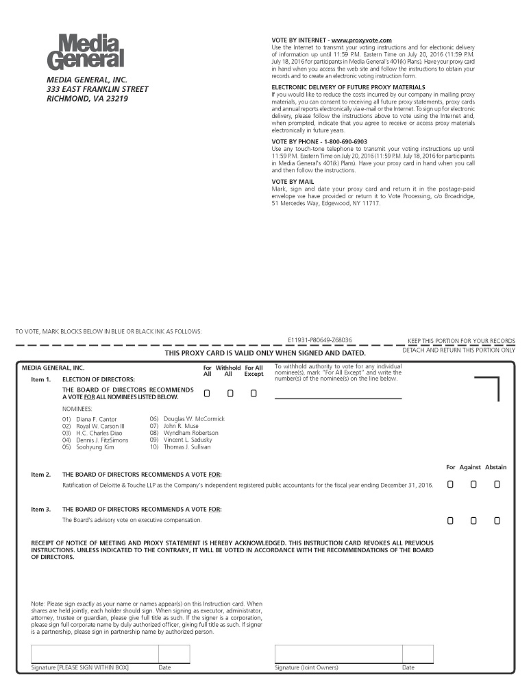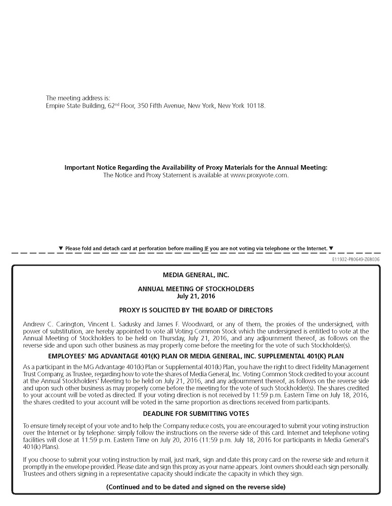 Stockholders are requested to vote by the Internet, by telephone or by completing and returning the accompanying proxy card in the envelope provided, whether or not they expect to attend the meeting in person. Internet and telephone voting facilities will close at 11:59 p.m. ET on July 20, 2016 (July 18, 2016 for participants in the Employees’ MG Advantage 401(k) Plan and/or the Media General, Inc. Supplemental 401(k) Plan). A proxy may be revoked at any time before it is voted.