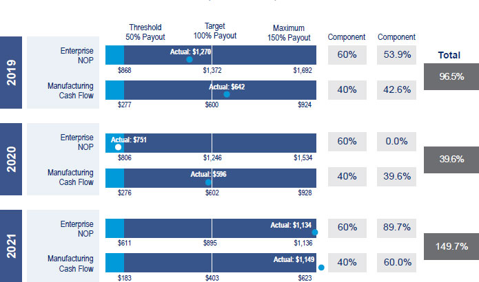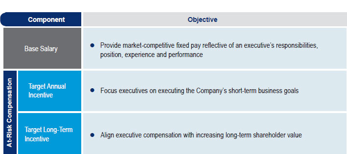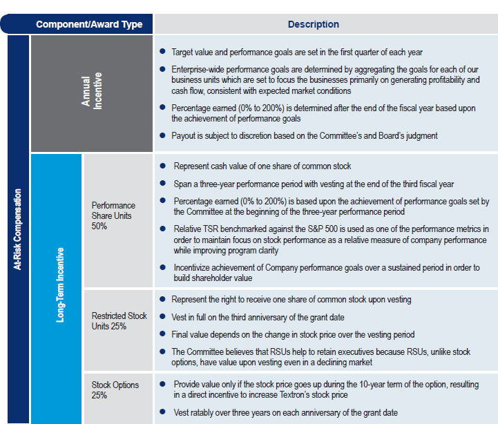 Textron’s compensation philosophy is to establish target total pay with reference to a talent peer group and to tie a substantial portion of our executives’ compensation to performance against objective business goals and stock price performance. This approach helps us to recruit and retain talented executives, incentivizes our executives to achieve desired business goals and aligns their interests with the interests of our shareholders. For a full discussion of our executive compensation programs and 2021 compensation decisions made by the Committee, see “Compensation Discussion and Analysis” beginning on page 24.