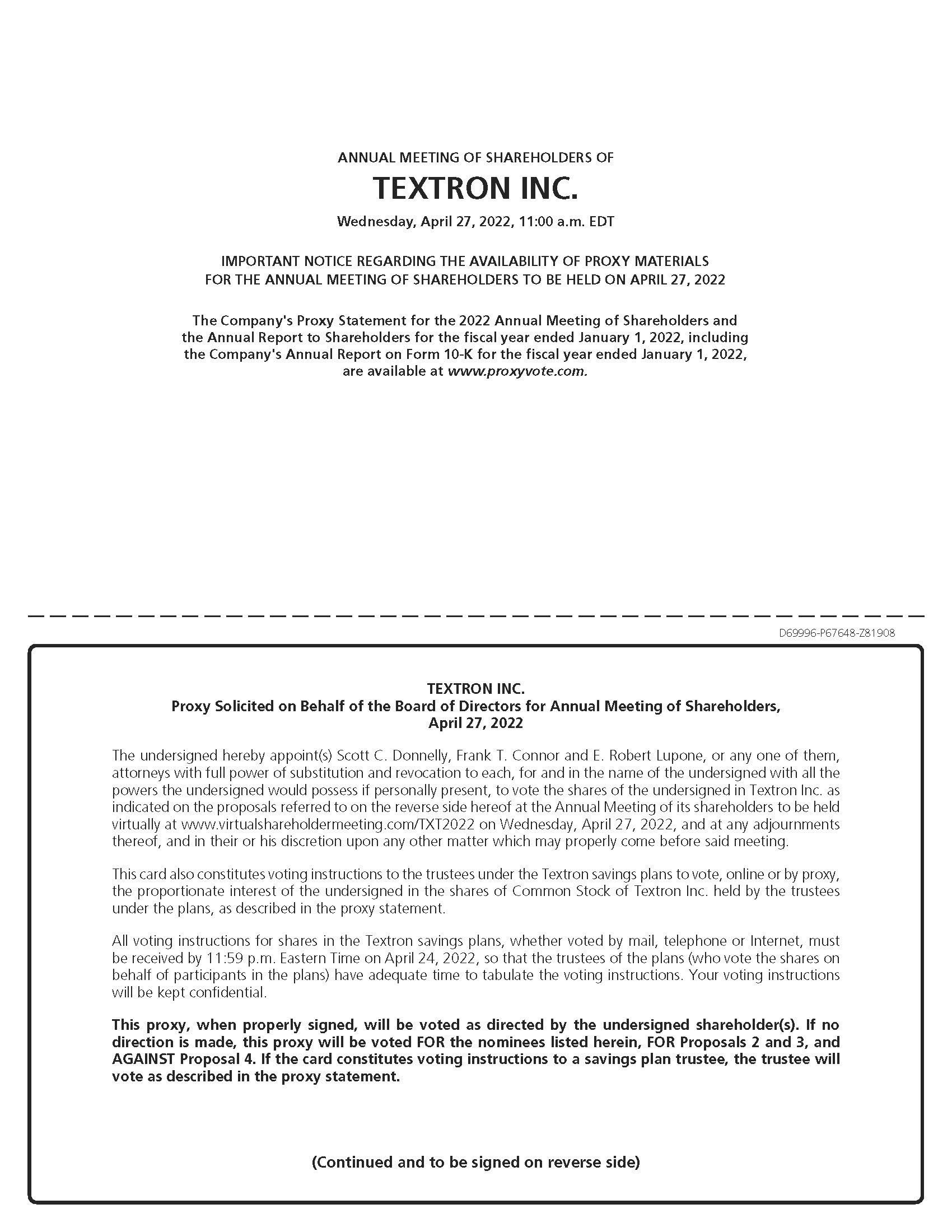 IMPORTANT NOTICE REGARDING THE AVAILABILITY OF PROXY MATERIALS FOR THE ANNUAL MEETING OF SHAREHOLDERS TO BE HELD ON APRIL 27, 2022 The Company's Proxy Statement for the 2022 Annual Meeting of Shareholders and the Annual Report to Shareholders for the fiscal year ended January 1, 2022, including the Company's Annual Report on Form 10-K for the fiscal year ended January 1, 2022, are available at www.proxyvote.com. ANNUAL MEETING OF SHAREHOLDERS OF TEXTRON INC. Wednesday, April 27, 2022, 11:00 a.m. EDT TEXTRON INC. Proxy Solicited on Behalf of the Board of Directors for Annual Meeting of Shareholders, April 27, 2022 The undersigned hereby appoint(s) Scott C. Donnelly, Frank T. Connor and E. Robert Lupone, or any one of them, attorneys with full power of substitution and revocation to each, for and in the name of the undersigned with all the powers the undersigned would possess if personally present, to vote the shares of the undersigned in Textron Inc. as indicated on the proposals referred to on the reverse side hereof at the Annual Meeting of its shareholders to be held virtually at www.virtualshareholdermeeting.com/TXT2022 on Wednesday, April 27, 2022, and at any adjournments thereof, and in their or his discretion upon any other matter which may properly come before said meeting. This card also constitutes voting instructions to the trustees under the Textron savings plans to vote, online or by proxy, the proportionate interest of the undersigned in the shares of Common Stock of Textron Inc. held by the trustees under the plans, as described in the proxy statement. All voting instructions for shares in the Textron savings plans, whether voted by mail, telephone or Internet, must be received by 11:59 p.m. Eastern Time on April 24, 2022, so that the trustees of the plans (who vote the shares on behalf of participants in the plans) have adequate time to tabulate the voting instructions. Your voting instructions will be kept confidential. This proxy, when properly signed, will be voted as directed by the undersigned shareholder(s). If no direction is made, this proxy will be voted FOR the nominees listed herein, FOR Proposals 2 and 3, and AGAINST Proposal 4. If the card constitutes voting instructions to a savings plan trustee, the trustee will vote as described in the proxy statement. (Continued and to be signed on reverse side)