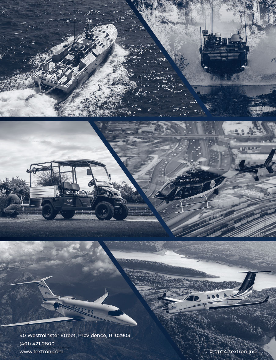 TEXTRON SYSTEMS Textron Systems’ businesses develop, manufacture and integrate products and services for U.S. and non-U.S. military, government and commercial customers to support defense, homeland security, aerospace and other missions. Product and service offerings include electronic systems and solutions, advanced marine craft, piston aircraft engines, live military air-to-air and air-to-ship training, weapons and related components, unmanned aircraft systems, and both manned and unmanned armored and specialty vehicles. TEXTRON eAVIATION Textron eAviation includes Pipistrel, a manufacturer of light aircraft, along with other research and development initiatives related to sustainable aviation solutions. Pipistrel offers a family of light aircraft and gliders with both electric and combustion engines. Pipistrel’s Velis Electro is the world’s first, and currently only, electric aircraft to receive full type certification from the European Union Aviation Safety Agency and from the UK Civil Aviation Authority. FINANCE Our Finance segment, operated by Textron Financial Corporation (TFC), is a commercial finance business that provides financing solutions for purchasers of Textron products, primarily Textron Aviation aircraft and Bell helicopters. For more than five decades, TFC has played a key role for Textron customers around the globe. |
