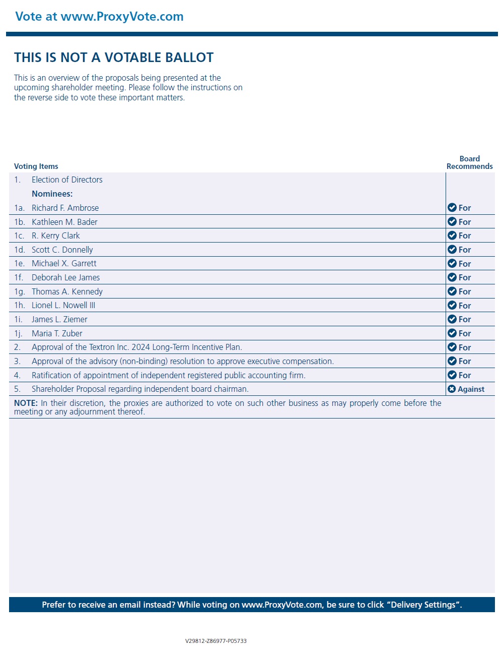 Vote at www.ProxyVote.com Prefer to receive an email instead? While voting on www.ProxyVote.com, be sure to click “Delivery Settings”. Voting Items Board Recommends V29812-Z86977-P05733 THIS IS NOT A VOTABLE BALLOT This is an overview of the proposals being presented at the upcoming shareholder meeting. Please follow the instructions on the reverse side to vote these important matters. 1. Election of Directors Nominees: 1a. Richard F. Ambrose For 1b. Kathleen M. Bader For 1c. R. Kerry Clark For 1d. Scott C. Donnelly For 1e. Michael X. Garrett For 1f. Deborah Lee James For 1g. Thomas A. Kennedy For 1h. Lionel L. Nowell III For 1i. James L. Ziemer For 1j. Maria T. Zuber For 2. Approval of the Textron Inc. 2024 Long-Term Incentive Plan. For 3. Approval of the advisory (non-binding) resolution to approve executive compensation. For 4. Ratification of appointment of independent registered public accounting firm. For 5. Shareholder Proposal regarding independent board chairman. Against NOTE: In their discretion, the proxies are authorized to vote on such other business as may properly come before the meeting or any adjournment thereof.