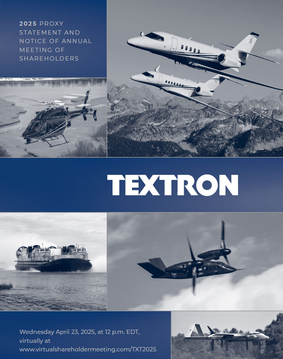 This proxy statement, which is first being made available to shareholders on or about March 4, 2025, is furnished in connection with the solicitation by the Board of Directors of Textron Inc. of proxies to be voted at the annual meeting of shareholders to be held on April 23, 2025, at 12:00 p.m. Eastern Daylight Time virtually via a live audio webcast and at any adjournments or postponements thereof. Shareholders will be able to attend the Annual Meeting, vote their shares and submit questions during the meeting at www.virtualshareholdermeeting.com/TXT2025.