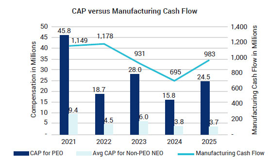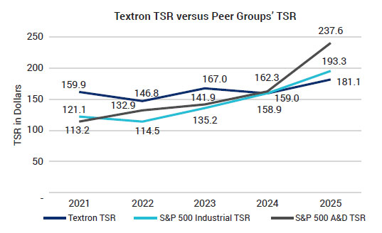 Textron’s compensation philosophy is to establish target total pay with reference to a talent peer group and to tie a substantial portion of our executives’ compensation to performance against objective business goals and stock price performance. This approach helps us to recruit and retain talented executives, incentivizes our executives to achieve desired business goals and aligns their interests with the interests of our shareholders. For a full discussion of our executive compensation programs and 2025 compensation decisions made by the Committee, see “Compensation Discussion and Analysis” beginning on page 25.