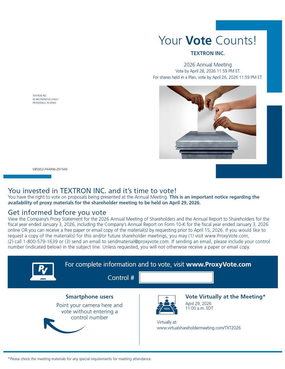 Your Vote Counts! Smartphone users Point your camera here and vote without entering a control number For complete information and to vote, visit www.ProxyVote.com Control # V85952-P44996-Z91949 *Please check the meeting materials for any special requirements for meeting attendance. TEXTRON INC. 40 WESTMINSTER STREET PROVIDENCE, RI 02903 2026 Annual Meeting Vote by April 28, 2026 11:59 PM ET. For shares held in a Plan, vote by April 26, 2026 11:59 PM ET. You invested in TEXTRON INC. and it’s time to vote! You have the right to vote on proposals being presented at the Annual Meeting. This is an important notice regarding the availability of proxy materials for the shareholder meeting to be held on April 29, 2026. Vote Virtually at the Meeting* April 29, 2026 11:00 a.m. EDT Virtually at: www.virtualshareholdermeeting.com/TXT2026 Get informed before you vote View the Company’s Proxy Statement for the 2026 Annual Meeting of Shareholders and the Annual Report to Shareholders for the fiscal year ended January 3, 2026, including the Company’s Annual Report on Form 10-K for the fiscal year ended January 3, 2026 online OR you can receive a free paper or email copy of the material(s) by requesting prior to April 15, 2026. If you would like to request a copy of the material(s) for this and/or future shareholder meetings, you may (1) visit www.ProxyVote.com, (2) call 1-800-579-1639 or (3) send an email to sendmaterial@proxyvote.com. If sending an email, please include your control number (indicated below) in the subject line. Unless requested, you will not otherwise receive a paper or email copy. TEXTRON INC.