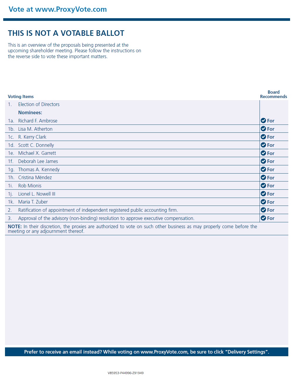 Vote at www.ProxyVote.com Prefer to receive an email instead? While voting on www.ProxyVote.com, be sure to click “Delivery Settings”. Voting Items Board Recommends V85953-P44996-Z91949 THIS IS NOT A VOTABLE BALLOT This is an overview of the proposals being presented at the upcoming shareholder meeting. Please follow the instructions on the reverse side to vote these important matters. 1. Election of Directors Nominees: 1a. Richard F. Ambrose For 1b. Lisa M. Atherton For 1c. R. Kerry Clark For 1d. Scott C. Donnelly For 1e. Michael X. Garrett For 1f. Deborah Lee James For 1g. Thomas A. Kennedy For 1h. Cristina Méndez For 1i. Rob Mionis For 1j. Lionel L. Nowell III For 1k. Maria T. Zuber For 2. Ratification of appointment of independent registered public accounting firm. For 3. Approval of the advisory (non-binding) resolution to approve executive compensation. For NOTE: In their discretion, the proxies are authorized to vote on such other business as may properly come before the meeting or any adjournment thereof.