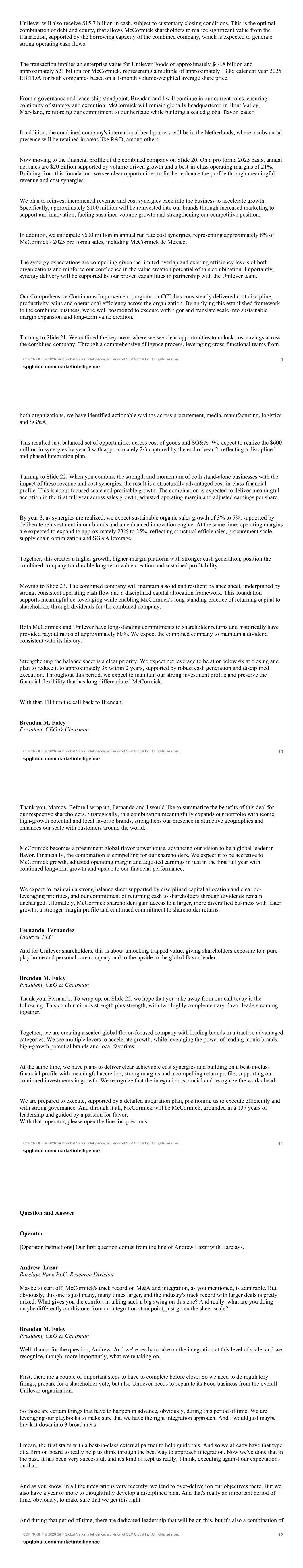COPYRIGHT © 2026 S&P Global Market Intelligence, a division of S&P Global Inc. All rights reserved. 9 spglobal.com/marketintelligence Unilever will also receive $15.7 billion in cash, subject to customary closing conditions. This is the optimal combination of debt and equity, that allows McCormick shareholders to realize significant value from the transaction, supported by the borrowing capacity of the combined company, which is expected to generate strong operating cash flows. The transaction implies an enterprise value for Unilever Foods of approximately $44.8 billion and approximately $21 billion for McCormick, representing a multiple of approximately 13.8x calendar year 2025 EBITDA for both companies based on a 1-month volume-weighted average share price. From a governance and leadership standpoint, Brendan and I will continue in our current roles, ensuring continuity of strategy and execution. McCormick will remain globally headquartered in Hunt Valley, Maryland, reinforcing our commitment to our heritage while building a scaled global flavor leader. In addition, the combined company's international headquarters will be in the Netherlands, where a substantial presence will be retained in areas like R&D, among others. Now moving to the financial profile of the combined company on Slide 20. On a pro forma 2025 basis, annual net sales are $20 billion supported by volume-driven growth and a best-in-class operating margins of 21%. Building from this foundation, we see clear opportunities to further enhance the profile through meaningful revenue and cost synergies. We plan to reinvest incremental revenue and cost synergies back into the business to accelerate growth. Specifically, approximately $100 million will be reinvested into our brands through increased marketing to support and innovation, fueling sustained volume growth and strengthening our competitive position. In addition, we anticipate $600 million in annual run rate cost synergies, representing approximately 8% of McCormick's 2025 pro forma sales, including McCormick de Mexico. The synergy expectations are compelling given the limited overlap and existing efficiency levels of both organizations and reinforce our confidence in the value creation potential of this combination. Importantly, synergy delivery will be supported by our proven capabilities in partnership with the Unilever team. Our Comprehensive Continuous Improvement program, or CCI, has consistently delivered cost discipline, productivity gains and operational efficiency across the organization. By applying this established framework to the combined business, we're well positioned to execute with rigor and translate scale into sustainable margin expansion and long-term value creation. Turning to Slide 21. We outlined the key areas where we see clear opportunities to unlock cost savings across the combined company. Through a comprehensive diligence process, leveraging cross-functional teams from COPYRIGHT © 2026 S&P Global Market Intelligence, a division of S&P Global Inc. All rights reserved. 10 spglobal.com/marketintelligence both organizations, we have identified actionable savings across procurement, media, manufacturing, logistics and SG&A. This resulted in a balanced set of opportunities across cost of goods and SG&A. We expect to realize the $600 million in synergies by year 3 with approximately 2/3 captured by the end of year 2, reflecting a disciplined and phased integration plan. Turning to Slide 22. When you combine the strength and momentum of both stand-alone businesses with the impact of these revenue and cost synergies, the result is a structurally advantaged best-in-class financial profile. This is about focused scale and profitable growth. The combination is expected to deliver meaningful accretion in the first full year across sales growth, adjusted operating margin and adjusted earnings per share. By year 3, as synergies are realized, we expect sustainable organic sales growth of 3% to 5%, supported by deliberate reinvestment in our brands and an enhanced innovation engine. At the same time, operating margins are expected to expand to approximately 23% to 25%, reflecting structural efficiencies, procurement scale, supply chain optimization and SG&A leverage. Together, this creates a higher growth, higher-margin platform with stronger cash generation, position the combined company for durable long-term value creation and sustained profitability. Moving to Slide 23. The combined company will maintain a solid and resilient balance sheet, underpinned by strong, consistent operating cash flow and a disciplined capital allocation framework. This foundation supports meaningful de-leveraging while enabling McCormick's long-standing practice of returning capital to shareholders through dividends for the combined company. Both McCormick and Unilever have long-standing commitments to shareholder returns and historically have provided payout ratios of approximately 60%. We expect the combined company to maintain a dividend consistent with its history. Strengthening the balance sheet is a clear priority. We expect net leverage to be at or below 4x at closing and plan to reduce it to approximately 3x within 2 years, supported by robust cash generation and disciplined execution. Throughout this period, we expect to maintain our strong investment profile and preserve the financial flexibility that has long differentiated McCormick. With that, I'll turn the call back to Brendan. Brendan M. Foley President, CEO & Chairman COPYRIGHT © 2026 S&P Global Market Intelligence, a division of S&P Global Inc. All rights reserved. 11 spglobal.com/marketintelligence Thank you, Marcos. Before I wrap up, Fernando and I would like to summarize the benefits of this deal for our respective shareholders. Strategically, this combination meaningfully expands our portfolio with iconic, high-growth potential and local favorite brands, strengthens our presence in attractive geographies