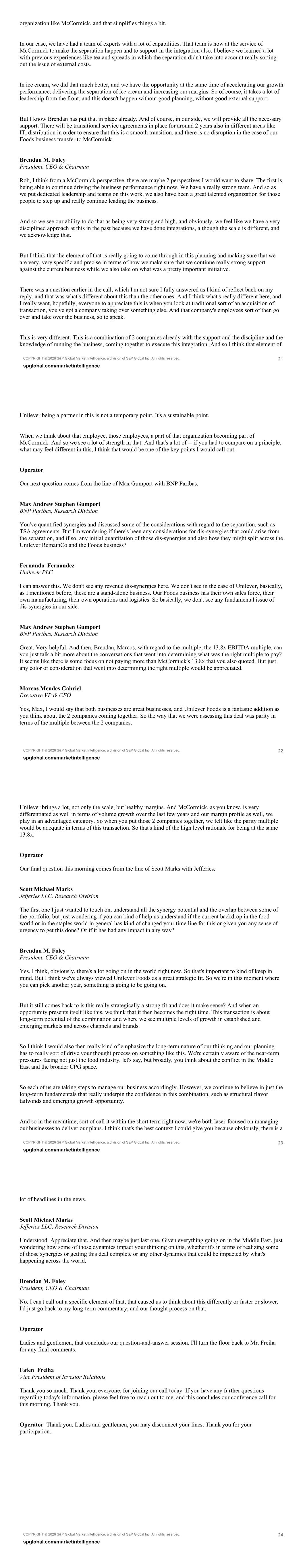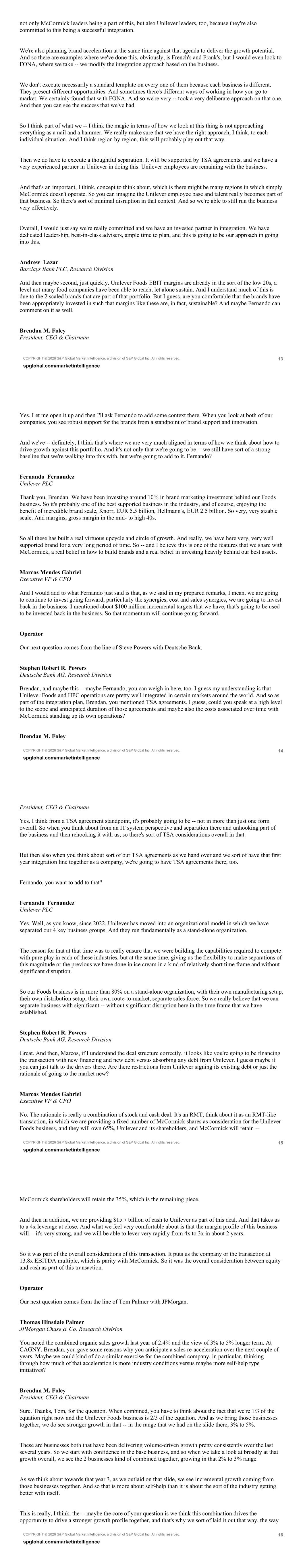 COPYRIGHT © 2026 S&P Global Market Intelligence, a division of S&P Global Inc. All rights reserved. 21 spglobal.com/marketintelligence organization like McCormick, and that simplifies things a bit. In our case, we have had a team of experts with a lot of capabilities. That team is now at the service of McCormick to make the separation happen and to support in the integration also. I believe we learned a lot with previous experiences like tea and spreads in which the separation didn't take into account really sorting out the issue of external costs. In ice cream, we did that much better, and we have the opportunity at the same time of accelerating our growth performance, delivering the separation of ice cream and increasing our margins. So of course, it takes a lot of leadership from the front, and this doesn't happen without good planning, without good external support. But I know Brendan has put that in place already. And of course, in our side, we will provide all the necessary support. There will be transitional service agreements in place for around 2 years also in different areas like IT, distribution in order to ensure that this is a smooth transition, and there is no disruption in the case of our Foods business transfer to McCormick. Brendan M. Foley President, CEO & Chairman Rob, I think from a McCormick perspective, there are maybe 2 perspectives I would want to share. The first is being able to continue driving the business performance right now. We have a really strong team. And so as we put dedicated leadership and teams on this work, we also have been a great talented organization for those people to step up and really continue leading the business. And so we see our ability to do that as being very strong and high, and obviously, we feel like we have a very disciplined approach at this in the past because we have done integrations, although the scale is different, and we acknowledge that. But I think that the element of that is really going to come through in this planning and making sure that we are very, very specific and precise in terms of how we make sure that we continue really strong support against the current business while we also take on what was a pretty important initiative. There was a question earlier in the call, which I'm not sure I fully answered as I kind of reflect back on my reply, and that was what's different about this than the other ones. And I think what's really different here, and I really want, hopefully, everyone to appreciate this is when you look at traditional sort of an acquisition of transaction, you've got a company taking over something else. And that company's employees sort of then go over and take over the business, so to speak. This is very different. This is a combination of 2 companies already with the support and the discipline and the knowledge of running the business, coming together to execute this integration. And so I think that element of COPYRIGHT © 2026 S&P Global Market Intelligence, a division of S&P Global Inc. All rights reserved. 22 spglobal.com/marketintelligence Unilever being a partner in this is not a temporary point. It's a sustainable point. When we think about that employee, those employees, a part of that organization becoming part of McCormick. And so we see a lot of strength in that. And that's a lot of -- if you had to compare on a principle, what may feel different in this, I think that would be one of the key points I would call out. Operator Our next question comes from the line of Max Gumport with BNP Paribas. Max Andrew Stephen Gumport BNP Paribas, Research Division You've quantified synergies and discussed some of the considerations with regard to the separation, such as TSA agreements. But I'm wondering if there's been any considerations for dis-synergies that could arise from the separation, and if so, any initial quantitation of those dis-synergies and also how they might split across the Unilever RemainCo and the Foods business? Fernando Fernandez Unilever PLC I can answer this. We don't see any revenue dis-synergies here. We don't see in the case of Unilever, basically, as I mentioned before, these are a stand-alone business. Our Foods business has their own sales force, their own manufacturing, their own operations and logistics. So basically, we don't see any fundamental issue of dis-synergies in our side. Max Andrew Stephen Gumport BNP Paribas, Research Division Great. Very helpful. And then, Brendan, Marcos, with regard to the multiple, the 13.8x EBITDA multiple, can you just talk a bit more about the conversations that went into determining what was the right multiple to pay? It seems like there is some focus on not paying more than McCormick's 13.8x that you also quoted. But just any color or consideration that went into determining the right multiple would be appreciated. Marcos Mendes Gabriel Executive VP & CFO Yes, Max, I would say that both businesses are great businesses, and Unilever Foods is a fantastic addition as you think about the 2 companies coming together. So the way that we were assessing this deal was parity in terms of the multiple between the 2 companies. COPYRIGHT © 2026 S&P Global Market Intelligence, a division of S&P Global Inc. All rights reserved. 23 spglobal.com/marketintelligence Unilever brings a lot, not only the scale, but healthy margins. And McCormick, as you know, is very differentiated as well in terms of volume growth over the last few years and our margin profile as well, we play in an advantaged category. So when you put those 2 companies together, we felt like the parity multiple would be adequate in terms of this transaction. So that's kind of the high level rationale for being at the same 13.8x. Operator Our final question this morning comes from the line of Scott Marks with Jefferies. Scott Michael Marks Jefferies LLC, Research Division The first one I just wanted to touch on, understand all the synergy potential and the overlap between some of the