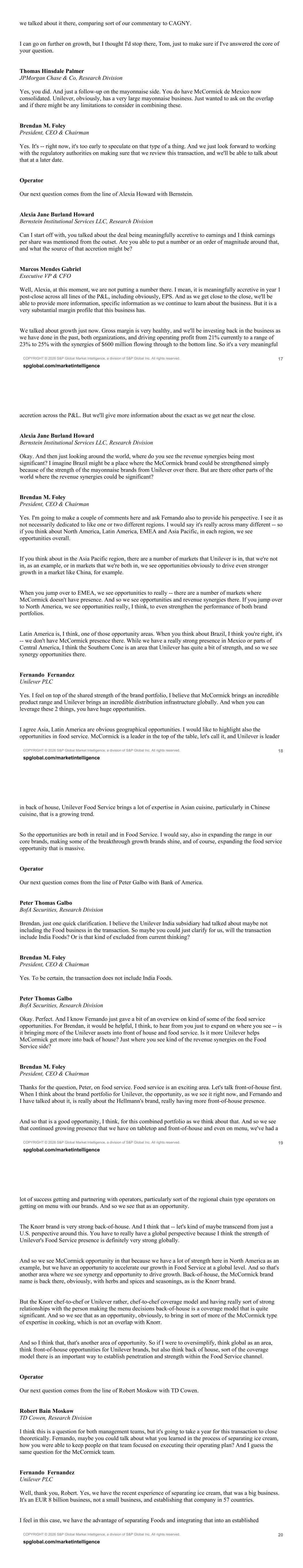 COPYRIGHT © 2026 S&P Global Market Intelligence, a division of S&P Global Inc. All rights reserved. 17 spglobal.com/marketintelligence we talked about it there, comparing sort of our commentary to CAGNY. I can go on further on growth, but I thought I'd stop there, Tom, just to make sure if I've answered the core of your question. Thomas Hinsdale Palmer JPMorgan Chase & Co, Research Division Yes, you did. And just a follow-up on the mayonnaise side. You do have McCormick de Mexico now consolidated. Unilever, obviously, has a very large mayonnaise business. Just wanted to ask on the overlap and if there might be any limitations to consider in combining these. Brendan M. Foley President, CEO & Chairman Yes. It's -- right now, it's too early to speculate on that type of a thing. And we just look forward to working with the regulatory authorities on making sure that we review this transaction, and we'll be able to talk about that at a later date. Operator Our next question comes from the line of Alexia Howard with Bernstein. Alexia Jane Burland Howard Bernstein Institutional Services LLC, Research Division Can I start off with, you talked about the deal being meaningfully accretive to earnings and I think earnings per share was mentioned from the outset. Are you able to put a number or an order of magnitude around that, and what the source of that accretion might be? Marcos Mendes Gabriel Executive VP & CFO Well, Alexia, at this moment, we are not putting a number there. I mean, it is meaningfully accretive in year 1 post-close across all lines of the P&L, including obviously, EPS. And as we get close to the close, we'll be able to provide more information, specific information as we continue to learn about the business. But it is a very substantial margin profile that this business has. We talked about growth just now. Gross margin is very healthy, and we'll be investing back in the business as we have done in the past, both organizations, and driving operating profit from 21% currently to a range of 23% to 25% with the synergies of $600 million flowing through to the bottom line. So it's a very meaningful COPYRIGHT © 2026 S&P Global Market Intelligence, a division of S&P Global Inc. All rights reserved. 18 spglobal.com/marketintelligence accretion across the P&L. But we'll give more information about the exact as we get near the close. Alexia Jane Burland Howard Bernstein Institutional Services LLC, Research Division Okay. And then just looking around the world, where do you see the revenue synergies being most significant? I imagine Brazil might be a place where the McCormick brand could be strengthened simply because of the strength of the mayonnaise brands from Unilever over there. But are there other parts of the world where the revenue synergies could be significant? Brendan M. Foley President, CEO & Chairman Yes. I'm going to make a couple of comments here and ask Fernando also to provide his perspective. I see it as not necessarily dedicated to like one or two different regions. I would say it's really across many different -- so if you think about North America, Latin America, EMEA and Asia Pacific, in each region, we see opportunities overall. If you think about in the Asia Pacific region, there are a number of markets that Unilever is in, that we're not in, as an example, or in markets that we're both in, we see opportunities obviously to drive even stronger growth in a market like China, for example. When you jump over to EMEA, we see opportunities to really -- there are a number of markets where McCormick doesn't have presence. And so we see opportunities and revenue synergies there. If you jump over to North America, we see opportunities really, I think, to even strengthen the performance of both brand portfolios. Latin America is, I think, one of those opportunity areas. When you think about Brazil, I think you're right, it's -- we don't have McCormick presence there. While we have a really strong presence in Mexico or parts of Central America, I think the Southern Cone is an area that Unilever has quite a bit of strength, and so we see synergy opportunities there. Fernando Fernandez Unilever PLC Yes. I feel on top of the shared strength of the brand portfolio, I believe that McCormick brings an incredible product range and Unilever brings an incredible distribution infrastructure globally. And when you can leverage these 2 things, you have huge opportunities. I agree Asia, Latin America are obvious geographical opportunities. I would like to highlight also the opportunities in food service. McCormick is a leader in the top of the table, let's call it, and Unilever is leader COPYRIGHT © 2026 S&P Global Market Intelligence, a division of S&P Global Inc. All rights reserved. 19 spglobal.com/marketintelligence in back of house, Unilever Food Service brings a lot of expertise in Asian cuisine, particularly in Chinese cuisine, that is a growing trend. So the opportunities are both in retail and in Food Service. I would say, also in expanding the range in our core brands, making some of the breakthrough growth brands shine, and of course, expanding the food service opportunity that is massive. Operator Our next question comes from the line of Peter Galbo with Bank of America. Peter Thomas Galbo BofA Securities, Research Division Brendan, just one quick clarification. I believe the Unilever India subsidiary had talked about maybe not including the Food business in the transaction. So maybe you could just clarify for us, will the transaction include India Foods? Or is that kind of excluded from current thinking? Brendan M. Foley President, CEO & Chairman Yes. To be certain, the transaction does not include India Foods. Peter Thomas Galbo BofA Securities, Research Division Okay. Perfect. And I know Fernando just gave a bit of an overview on kind of some of the food service opportunities. For Brendan, it would be helpful, I think, to hear from you just to expand on where you see -- i