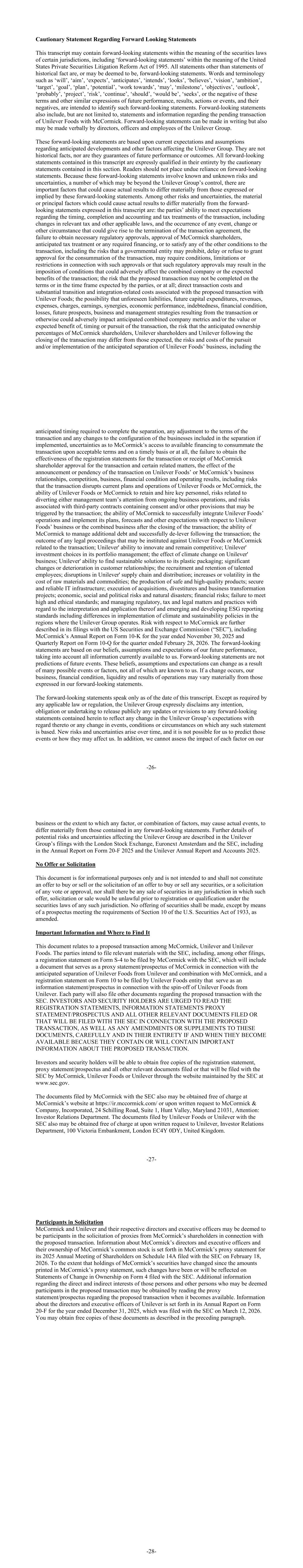 Cautionary Statement Regarding Forward Looking Statements This transcript may contain forward-looking statements within the meaning of the securities laws of certain jurisdictions, including ‘forward-looking statements’ within the meaning of the United States Private Securities Litigation Reform Act of 1995. All statements other than statements of historical fact are, or may be deemed to be, forward-looking statements. Words and terminology such as ‘will’, ‘aim’, ‘expects’, ‘anticipates’, ‘intends’, ‘looks’, ‘believes’, ‘vision’, ‘ambition’, ‘target’, ‘goal’, ‘plan’, ‘potential’, ‘work towards’, ‘may’, ‘milestone’, ‘objectives’, ‘outlook’, ‘probably’, ‘project’, ‘risk’, ‘continue’, ‘should’, ‘would be’, ‘seeks’, or the negative of these terms and other similar expressions of future performance, results, actions or events, and their negatives, are intended to identify such forward-looking statements. Forward-looking statements also include, but are not limited to, statements and information regarding the pending transaction of Unilever Foods with McCormick. Forward-looking statements can be made in writing but also may be made verbally by directors, officers and employees of the Unilever Group. These forward-looking statements are based upon current expectations and assumptions regarding anticipated developments and other factors affecting the Unilever Group. They are not historical facts, nor are they guarantees of future performance or outcomes. All forward-looking statements contained in this transcript are expressly qualified in their entirety by the cautionary statements contained in this section. Readers should not place undue reliance on forward-looking statements. Because these forward-looking statements involve known and unknown risks and uncertainties, a number of which may be beyond the Unilever Group’s control, there are important factors that could cause actual results to differ materially from those expressed or implied by these forward-looking statements. Among other risks and uncertainties, the material or principal factors which could cause actual results to differ materially from the forward- looking statements expressed in this transcript are: the parties’ ability to meet expectations regarding the timing, completion and accounting and tax treatments of the transaction, including changes in relevant tax and other applicable laws, and the occurrence of any event, change or other circumstance that could give rise to the termination of the transaction agreement, the failure to obtain necessary regulatory approvals, approval of McCormick shareholders, anticipated tax treatment or any required financing, or to satisfy any of the other conditions to the transaction, including the risks that a governmental entity may prohibit, delay or refuse to grant approval for the consummation of the transaction, may require conditions, limitations or restrictions in connection with such approvals or that such regulatory approvals may result in the imposition of conditions that could adversely affect the combined company or the expected benefits of the transaction; the risk that the proposed transaction may not be completed on the terms or in the time frame expected by the parties, or at all; direct transaction costs and substantial transition and integration-related costs associated with the proposed transaction with Unilever Foods; the possibility that unforeseen liabilities, future capital expenditures, revenues, expenses, charges, earnings, synergies, economic performance, indebtedness, financial condition, losses, future prospects, business and management strategies resulting from the transaction or otherwise could adversely impact anticipated combined company metrics and/or the value or expected benefit of, timing or pursuit of the transaction, the risk that the anticipated ownership percentages of McCormick shareholders, Unilever shareholders and Unilever following the closing of the transaction may differ from those expected, the risks and costs of the pursuit and/or implementation of the anticipated separation of Unilever Foods’ business, including the -26- anticipated timing required to complete the separation, any adjustment to the terms of the transaction and any changes to the configuration of the businesses included in the separation if implemented, uncertainties as to McCormick’s access to available financing to consummate the transaction upon acceptable terms and on a timely basis or at all, the failure to obtain the effectiveness of the registration statements for the transaction or receipt of McCormick shareholder approval for the transaction and certain related matters, the effect of the announcement or pendency of the transaction on Unilever Foods’ or McCormick’s business relationships, competition, business, financial condition and operating results, including risks that the transaction disrupts current plans and operations of Unilever Foods or McCormick, the ability of Unilever Foods or McCormick to retain and hire key personnel, risks related to diverting either management team’s attention from ongoing business operations, and risks associated with third-party contracts containing consent and/or other provisions that may be triggered by the transaction; the ability of McCormick to successfully integrate Unilever Foods’ operations and implement its plans, forecasts and other expectations with respect to Unilever Foods’ business or the combined business after the closing of the transaction; the ability of McCormick to manage additional debt and successfully de-lever following the transaction; the outcome of any legal proceedings that may be instituted against Unilever Foods or McCormick related to the transaction; Unilever' ability to innovate and remain competitive; Unilever' investment choices in its portfolio management; the effect of climate cha