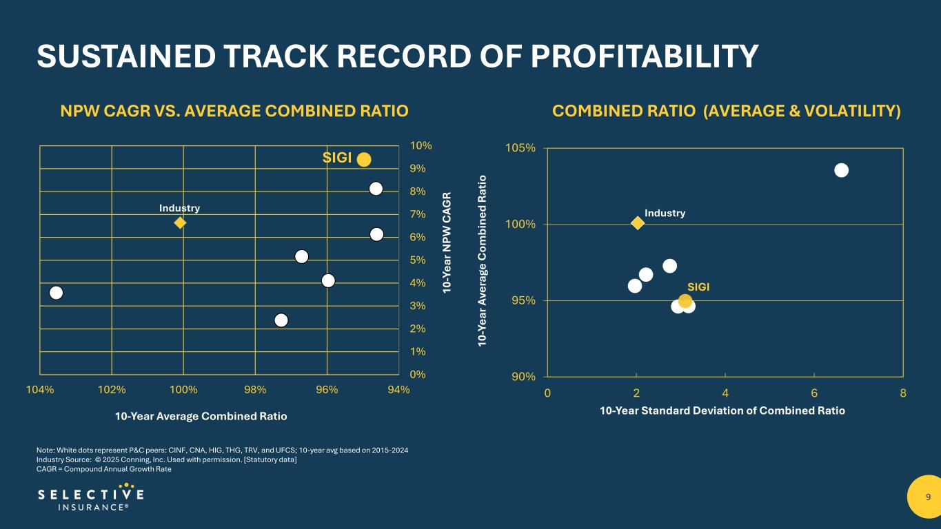 90% 95% 100% 105% 0 2 4 6 8 10 -Y ea r A ve ra ge C om bi ne d R at io 10-Year Standard Deviation of Combined Ratio 0% 1% 2% 3% 4% 5% 6% 7% 8% 9% 10% 94%96%98%100%102%104% 10 -Y ea r N PW C AG R 10-Year Average Combined Ratio NPW CAGR VS. AVERAGE COMBINED RATIO Note: White dots represent P&C peers: CINF, CNA, HIG, THG, TRV, and UFCS; 10-year avg based on 2015-2024 Industry Source: © 2025 Conning, Inc. Used with permission. [Statutory data] CAGR = Compound Annual Growth Rate COMBINED RATIO (AVERAGE & VOLATILITY) Industry Industry SIGI SUSTAINED TRACK RECORD OF PROFITABILITY 9 SIGI