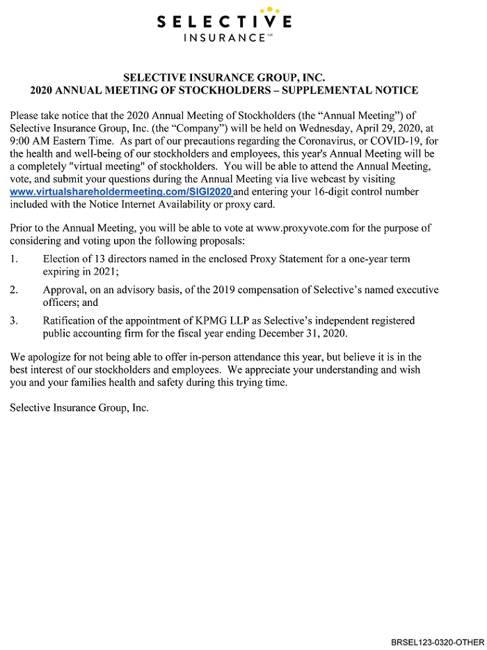 SELECTIVE INSURANCE GROUP, INC. 2020 ANNUAL MEETING OF STOCKHOLDERS – SUPPLEMENTAL NOTICE Please take notice that the 2020 Annual Meeting of Stockholders (the “Annual Meeting”) of Selective Insurance Group, Inc. (the “Company”) will be held on Wednesday, April 29, 2020, at 9:00 AM Eastern Time. As part of our precautions regarding the Coronavirus, or COVID-19, for the health and well-being of our stockholders and employees, this year's Annual Meeting will be a completely "virtual meeting" of stockholders. You will be able to attend the Annual Meeting, vote, and submit your questions during the Annual Meeting via live webcast by visiting www.virtualshareholdermeeting.com/SIGI2020 and entering your 16-digit control number included with the Notice Internet Availability or proxy card. Prior to the Annual Meeting, you will be able to vote at www.proxyvote.com for the purpose of considering and voting upon the following proposals: 1. Election of 13 directors named in the enclosed Proxy Statement for a one-year term expiring in 2021; 2. Approval, on an advisory basis, of the 2019 compensation of Selective’s named executive officers; and 3. Ratification of the appointment of KPMG LLP as Selective’s independent registered public accounting firm for the fiscal year ending December 31, 2020. We apologize for not being able to offer in-person attendance this year, but believe it is in the best interest of our stockholders and employees. We appreciate your understanding and wish you and your families health and safety during this trying time. Selective Insurance Group, Inc. BRSEL123-0320-OTHER