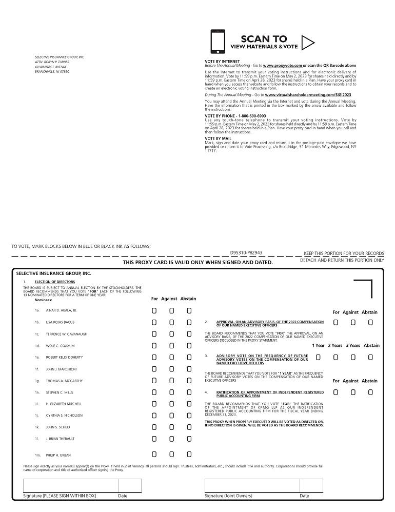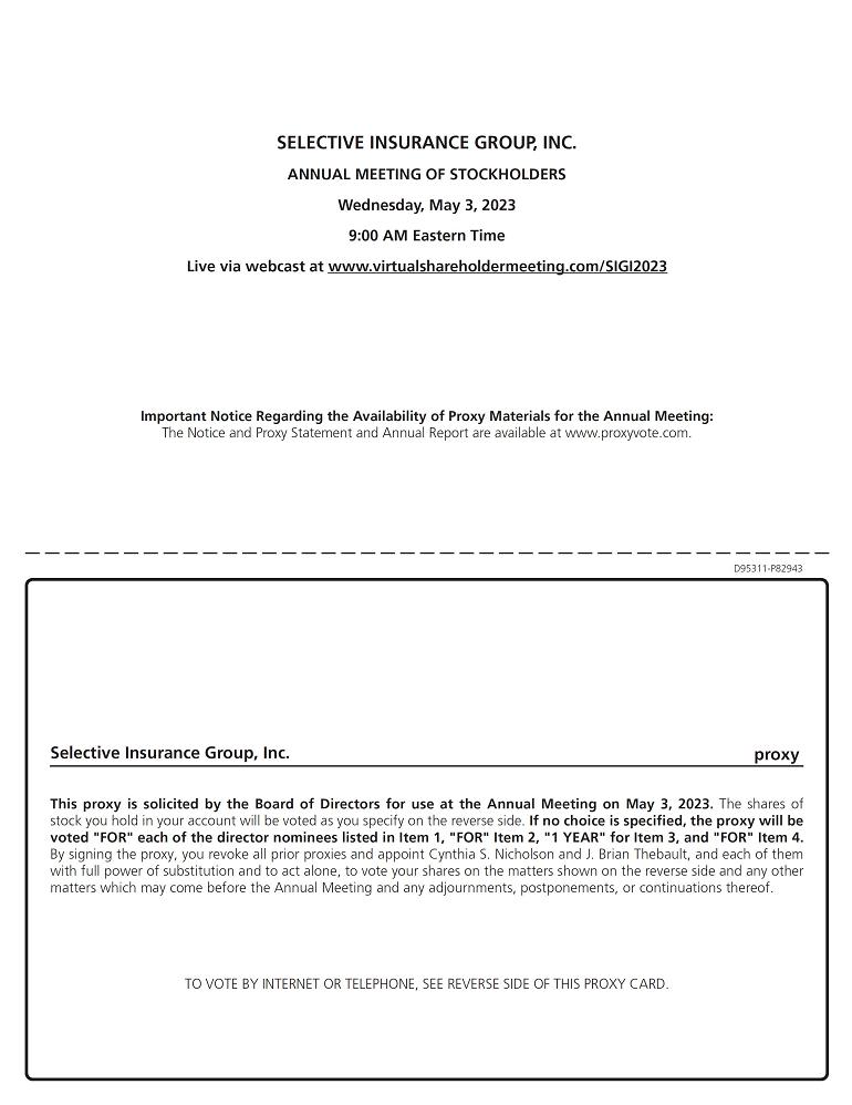 The 2023 Annual Meeting of Stockholders (the “Annual Meeting”) of Selective Insurance Group, Inc. (“Selective,” “we,” “us,” and “our”) will be held virtually on Wednesday, May 3, 2023, at 9:00 AM Eastern Time exclusively via live audiocast. The Annual Meeting will not have a physical location, and you will not be able to attend the meeting in person. You can participate, vote, and submit your questions online during the Annual Meeting by visiting http://www.virtualshareholdermeeting.com/SIGI2023 and entering the 16-digit control number on your proxy card. See below for additional information regarding the virtual meeting format.