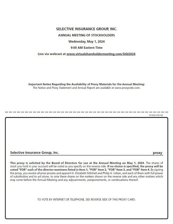 SELECTIVE INSURANCE GROUP, INC. ANNUAL MEETING OF STOCKHOLDERS Wednesday, May 1, 2024 9:00 AM Eastern Time Live via webcast at www.virtualshareholdermeeting.com/SIGI2024Important Notice Regarding the Availability of Proxy Materials for the Annual Meeting: The Notice and Proxy Statement and Annual Report are available at www.proxyvote.com.V31026-P02103Selective Insurance Group, Inc. proxyThis proxy is solicited by the Board of Directors for use at the Annual Meeting on May 1, 2024. The shares of stock you hold in your account will be voted as you specify on the reverse side. If no choice is specified, the proxy will be voted "FOR" each of the director nominees listed in Item 1, "FOR" Item 2, "FOR" Item 3, and "FOR" Item 4. By signing the proxy, you revoke all prior proxies and appoint H. Elizabeth Mitchell and Philip H. Urban, and each of them with full power of substitution and to act alone, to vote these shares on the matters shown on the reverse side and any other matters which may come before the Annual Meeting and any adjournments, postponements, or continuations thereof.TO VOTE BY INTERNET OR TELEPHONE, SEE REVERSE SIDE OF THIS PROXY CARD.