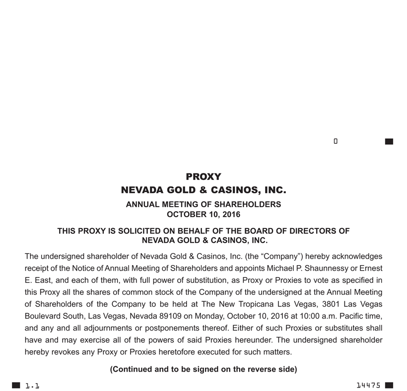 The Annual Meeting of Shareholders of Nevada Gold & Casinos, Inc. (the “Company”) will be held at The New Tropicana Las Vegas, 3801 Las Vegas Boulevard South, Las Vegas, Nevada 89109 on Monday, October 10, 2016, commencing at 10:00 a.m. local time. At the meeting only holders of common stock of record at the close of business on August 19, 2016 will be entitled to vote on the following items: