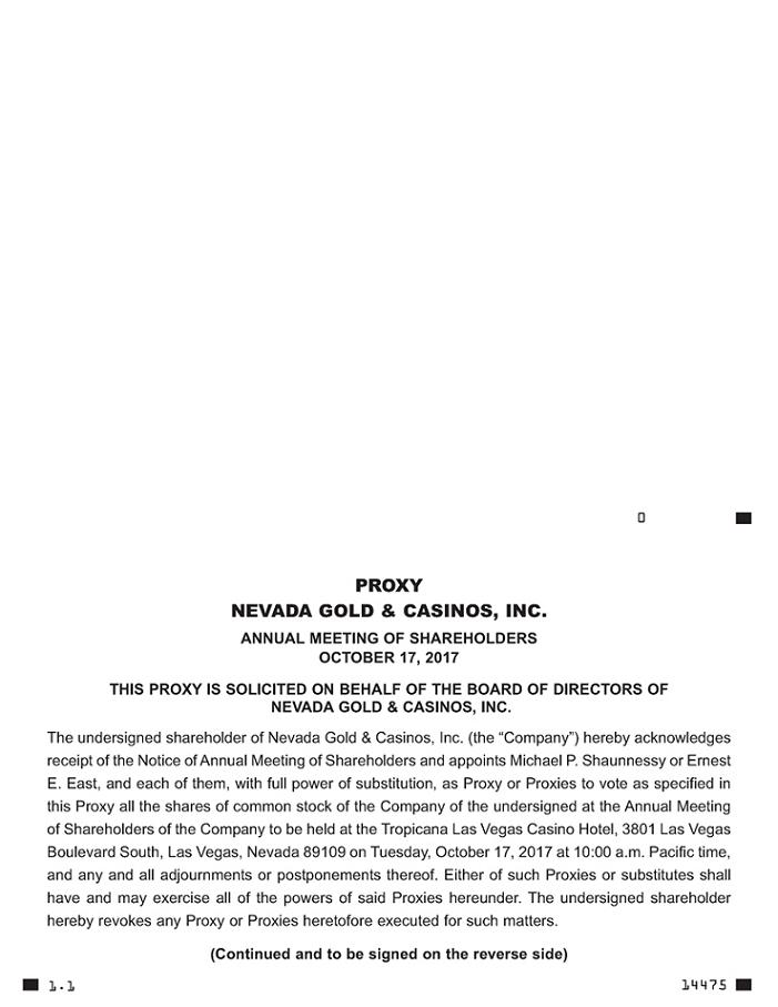 | PROXY NEVADA GOLD & CASINOS, INC. ANNUAL MEETING OF SHAREHOLDERS OCTOBER 17, 2017 THIS PROXY IS SOLICITED ON BEHALF OF THE BOARD OF DIRECTORS OF NEVADA GOLD & CASINOS, INC. The undersigned shareholder of Nevada Gold & Casinos, Inc. (the “Company”) hereby acknowledges receipt of the Notice of Annual Meeting of Shareholders and appoints Michael P. Shaunnessy or Ernest E. East, and each of them, with full power of substitution, as Proxy or Proxies to vote as specified in this Proxy all the shares of common stock of the Company of the undersigned at the Annual Meeting of Shareholders of the Company to be held at the Tropicana Las Vegas Casino Hotel, 3801 Las Vegas Boulevard South, Las Vegas, Nevada 89109 on Tuesday, October 17, 2017 at 10:00 a.m. Pacific time, and any and all adjournments or postponements thereof. Either of such Proxies or substitutes shall have and may exercise all of the powers of said Proxies hereunder. The undersigned shareholder hereby revokes any Proxy or Proxies heretofore executed for such matters. (Continued and to be signed on the reverse side) 1.1 14475 |