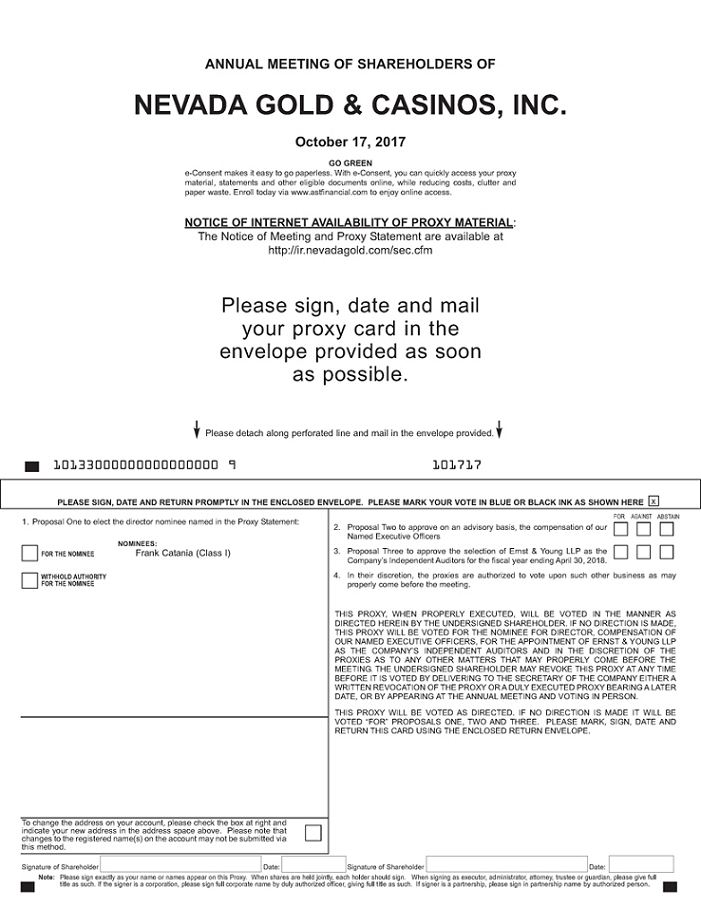 | ANNUAL MEETING OF SHAREHOLDERS OF NEVADA GOLD & CASINOS, INC. October 17, 2017 GO GREEN e-Consent makes it easy to go paperless. With e-Consent, you can quickly access your proxy material, statements and other eligible documents online, while reducing costs, clutter and paper waste. Enroll today via www.astfinancial.com to enjoy online access. NOTICE OF INTERNET AVAILABILITY OF PROXY MATERIAL: The Notice of Meeting and Proxy Statement are available at http://ir.nevadagold.com/sec.cfm Please sign, date and mail your proxy card in the envelope provided as soon as possible. Please detach along perforated line and mail in the envelope provided. 10133000000000000000 9 101717 PLEASE SIGN, DATE AND RETURN PROMPTLY IN THE ENCLOSED ENVELOPE. PLEASE MARK YOUR VOTE IN BLUE OR BLACK INK AS SHOWN HERE 1. Proposal One to elect the director nominee named in the Proxy Statement: NOMINEES: • FOR THE NOMINEE Frank Catania (Class I) • WITHHOLD AUTHORITY FOR THE NOMINEE FOR AGAINST ABSTAIN 2. Proposal Two to approve on an advisory basis, the compensation of our Named Executive Officers • • • 3. Proposal Three to approve the selection of Ernst & Young LLP as the Company’s Independent Auditors for the fiscal year ending April 30, 2018. • • • 4. In their discretion, the proxies are authorized to vote upon such other business as may properly come before the meeting. THIS PROXY, WHEN PROPERLY EXECUTED, WILL BE VOTED IN THE MANNER AS DIRECTED HEREIN BY THE UNDERSIGNED SHAREHOLDER. IF NO DIRECTION IS MADE, THIS PROXY WILL BE VOTED FOR THE NOMINEE FOR DIRECTOR, COMPENSATION OF OUR NAMED EXECUTIVE OFFICERS, FOR THE APPOINTMENT OF ERNST & YOUNG LLP AS THE COMPANY’S INDEPENDENT AUDITORS AND IN THE DISCRETION OF THE PROXIES AS TO ANY OTHER MATTERS THAT MAY PROPERLY COME BEFORE THE MEETING. THE UNDERSIGNED SHAREHOLDER MAY REVOKE THIS PROXY AT ANY TIME BEFORE IT IS VOTED BY DELIVERING TO THE SECRETARY OF THE COMPANY EITHER A WRITTEN REVOCATION OF THE PROXY OR A DULY EXECUTED PROXY BEARING A LATER DATE, OR BY APPEARING AT THE ANNUAL MEETING AND VOTING IN PERSON. THIS PROXY WILL BE VOTED AS DIRECTED. IF NO DIRECTION IS MADE IT WILL BE VOTED “FOR” PROPOSALS ONE, TWO AND THREE. PLEASE MARK, SIGN, DATE AND RETURN THIS CARD USING THE ENCLOSED RETURN ENVELOPE. To change the address on your account, please check the box at right and indicate your new address in the address space above. Please note that changes to the registered name(s) on the account may not be submitted via this method. • Signature of Shareholder Date: Signature of Shareholder Date: Note: Please sign exactly as your name or names appear on this Proxy. When shares are held jointly, each holder should sign. When signing as executor, administrator, attorney, trustee or guardian, please give full title as such. If the signer is a corporation, please sign full corporate name by duly authorized officer, giving full title as such. If signer is a partnership, please sign in partnership name by authorized person. |