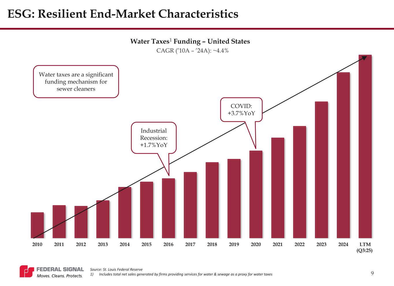 2010 2011 2012 2013 2014 2015 2016 2017 2018 2019 2020 2021 2022 2023 2024 LTM (Q3:25) 9 ESG: Resilient End-Market Characteristics Water Taxes1 Funding – United States CAGR (’10A – ’24A): ~4.4% Industrial Recession: +1.7%YoY COVID: +3.7%YoY Source: St. Louis Federal Reserve 1) Includes total net sales generated by firms providing services for water & sewage as a proxy for water taxes Water taxes are a significant funding mechanism for sewer cleaners