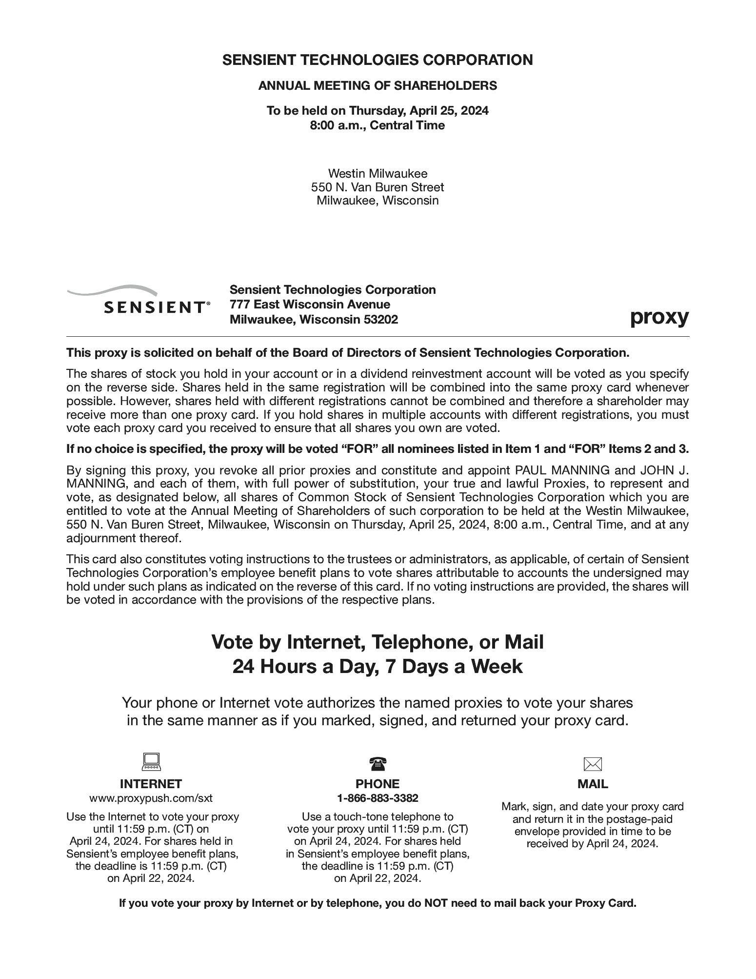 The Company maintains change of control agreements with all of its executive officers, including the named executive officers. These agreements are customary in Sensient’s industry and help to attract and retain key executives in the event of a change of control. These agreements are not employment agreements and have no effect unless there is a change of control. For these purposes, a “change of control” ordinarily occurs if a person acquires 30% or more of Sensient’s Common Stock, a majority of Sensient’s Board consists of persons other than those nominated by the Board, or Sensient is a party to a merger, consolidation, or sale of assets, or acquires the assets of another entity, and Sensient’s shareholders have less than 50% of the Common Stock and voting power of the resulting entity.