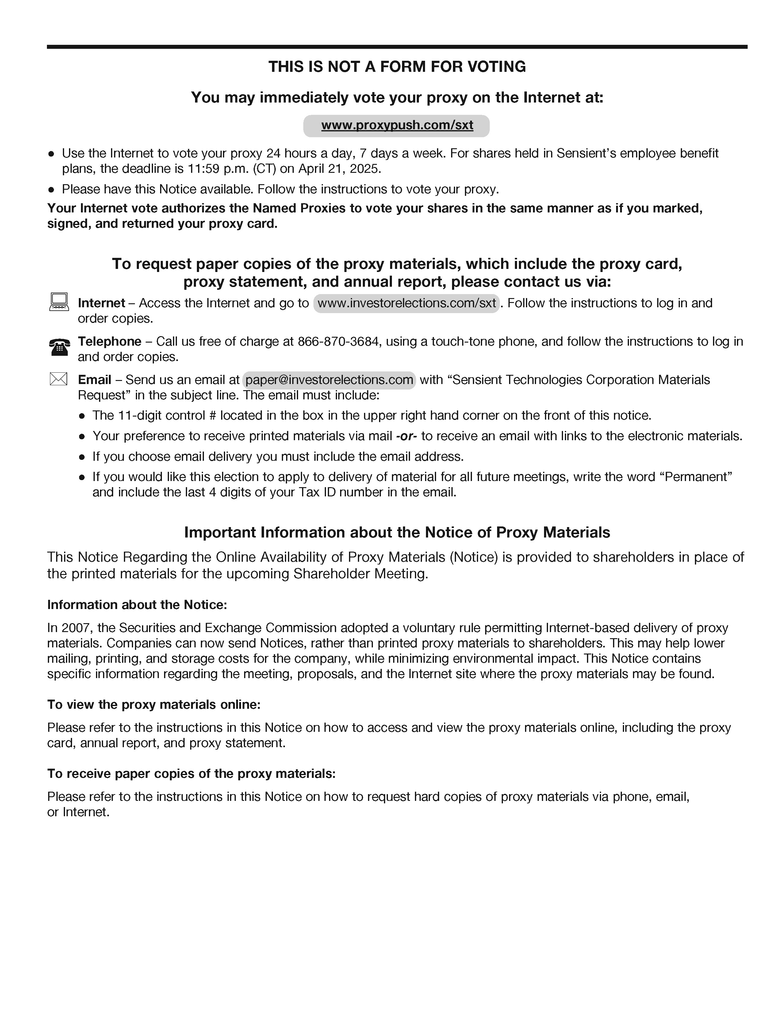 – Call us free of charge at 866-870-3684, using a touch-tone phone, and follow the instructions to log in and order copies. Email – Send us an email at paper@investorelections.com with “Sensient Technologies Corporation Materials Request”