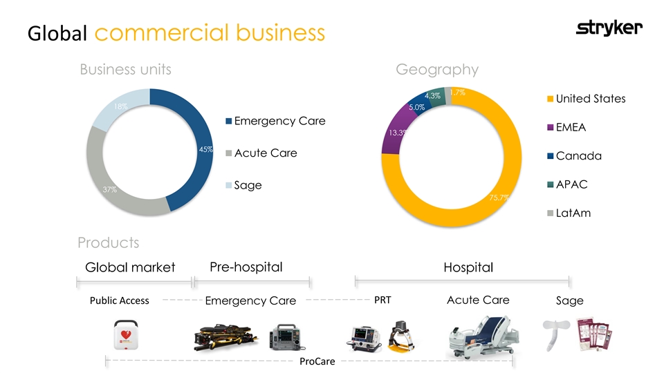 Global commercial business Business units Geography 1.7% 4.3% United States 18% 5.0% Emergency Care EMEA 13.3% 45% Acute Care Canada Sage APAC 37% 75.7% LatAm Products Global market Pre-hospital Hospital Public Access PRT Acute Care Emergency Care Sage ProCare