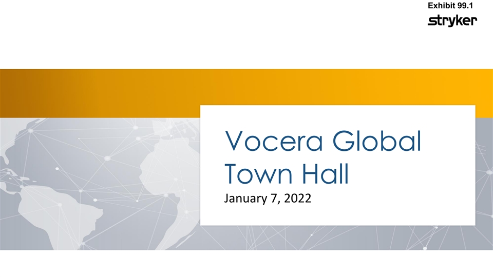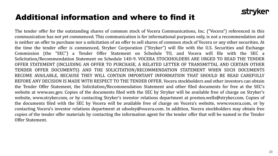 Additional information and where to find it The tender offer for the outstanding shares of common stock of Vocera Communications, Inc.(“Vocera ”) referenced in this communicationhasnotyetcommenced.Thiscommunicationisforinformationalpurposesonly,isnotarecommendationand isneitheranoffertopurchasenorasolicitationofanoffertosellsharesofcommonstockofVoceraoranyothersecurities.At the time the tender offer is commenced, Stryker Corporation(“Stryker”) will file with the U.S. Securities and Exchange Commission (the“SEC”) a Tender Offer Statement on Schedule TO, and Vocera will file with the SEC a Solicitation/Recommendation Statement on Schedule 14D-9. VOCERA STOCKHOLDERS ARE URGED TO READ THE TENDER OFFER STATEMENT (INCLUDING AN OFFER TO PURCHASE, A RELATED LETTER OF TRANSMITTAL AND CERTAIN OTHER TENDER OFFER DOCUMENTS) AND THE SOLICITATION/RECOMMENDATION STATEMENT WHEN SUCH DOCUMENTS BECOME AVAILABLE, BECAUSE THEY WILL CONTAIN IMPORTANT INFORMATION THAT SHOULD BE READ CAREFULLY BEFOREANYDECISIONISMADEWITHRESPECTTOTHETENDEROFFER.Vocerastockholdersandotherinvestorscanobtain the Tender Offer Statement, the Solicitation/Recommendation Statement and other filed documents for free at theSEC’s website at www.sec.gov. Copies of the documents filed with the SEC by Stryker will be available free of charge onStryker’s website, www.stryker.com, or by contactingStryker’s investor relations department at preston.wells@stryker.com. Copies of the documents filed with the SEC by Vocera will be available free of charge onVocera’s website, www.vocera.com, or by contactingVocera’s investor relations department at sdooley@vocera.com. In addition, Vocera stockholders may obtain free copies ofthe tender offermaterials bycontacting the information agent forthe tender offerthat willbe namedin the Tender OfferStatement. 20