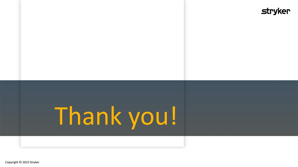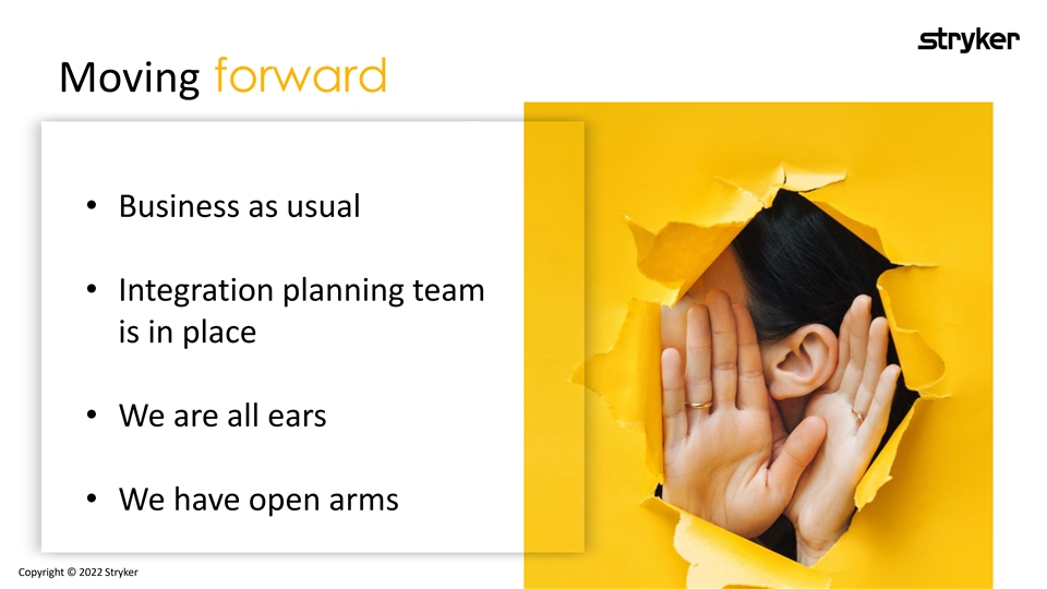 Moving forward • Business as usual • Integration planning team is in place • We are all ears • We have open arms Copyright © 2022 Stryker