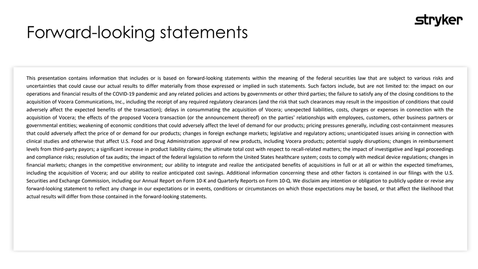 Forward-looking statements This presentation contains information that includes or is based on forward-looking statements within the meaning of the federal securities law that are subject to various risks and uncertainties that could cause our actual results to differ materially from those expressed or implied in such statements. Such factors include, but are not limited to: the impact on our operations and financial results of the COVID-19 pandemic and any related policies and actions by governments or other third parties; the failure to satisfy any of the closing conditions to the acquisition of Vocera Communications, Inc., including the receipt of any required regulatory clearances (and the risk that such clearances may result in the imposition of conditions that could adversely affect the expected benefits of the transaction); delays in consummating the acquisition of Vocera; unexpected liabilities, costs, charges or expenses in connection with the acquisition of Vocera; the effects of the proposed Vocera transaction (or the announcement thereof) on the parties' relationships with employees, customers, other business partners or governmental entities; weakening of economic conditions that could adversely affect the level of demand for our products; pricing pressures generally, including cost-containment measures that could adversely affect the price of or demand for our products; changes in foreign exchange markets; legislative and regulatory actions; unanticipated issues arising in connection with clinical studies and otherwise that affect U.S. Food and Drug Administration approval of new products, including Vocera products; potential supply disruptions; changes in reimbursement levels from third-party payors; a significant increase in product liability claims; the ultimate total cost with respect to recall-related matters; the impact of investigative and legal proceedings and compliance risks; resolution of tax audits; the impact of the federal legislation to reform the United States healthcare system; costs to comply with medical device regulations; changes in financial markets; changes in the competitive environment; our ability to integrate and realize the anticipated benefits of acquisitions in full or at all or within the expected timeframes, including the acquisition of Vocera; and our ability to realize anticipated cost savings. Additional information concerning these and other factors is contained in our filings with the U.S. Securities and Exchange Commission, including our Annual Report on Form 10-K and Quarterly Reports on Form 10-Q. We disclaim any intention or obligation to publicly update or revise any forward-looking statement to reflect any change in our expectations or in events, conditions or circumstances on which those expectations may be based, or that affect the likelihood that actual results will differ from those contained in the forward-looking statements.