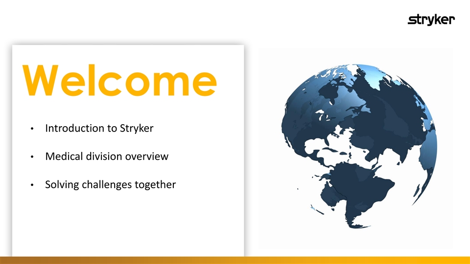 Welcome • Introduction to Stryker • Medical division overview • Solving challenges together