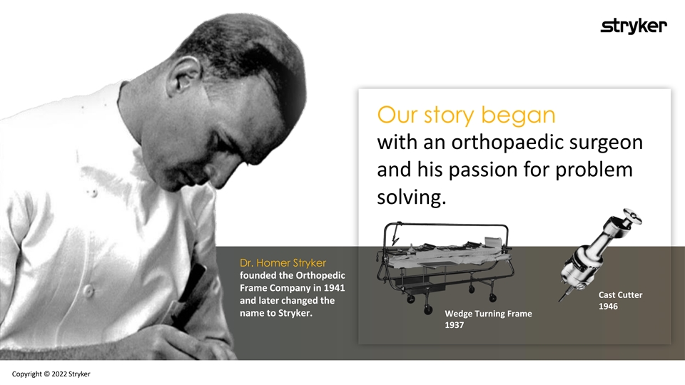 Our story began with an orthopaedic surgeon and his passion for problem solving. Dr. Homer Stryker founded the Orthopedic Frame Company in 1941 Cast Cutter and later changed the 1946 name to Stryker. Wedge Turning Frame 1937 Copyright © 2022 Stryker