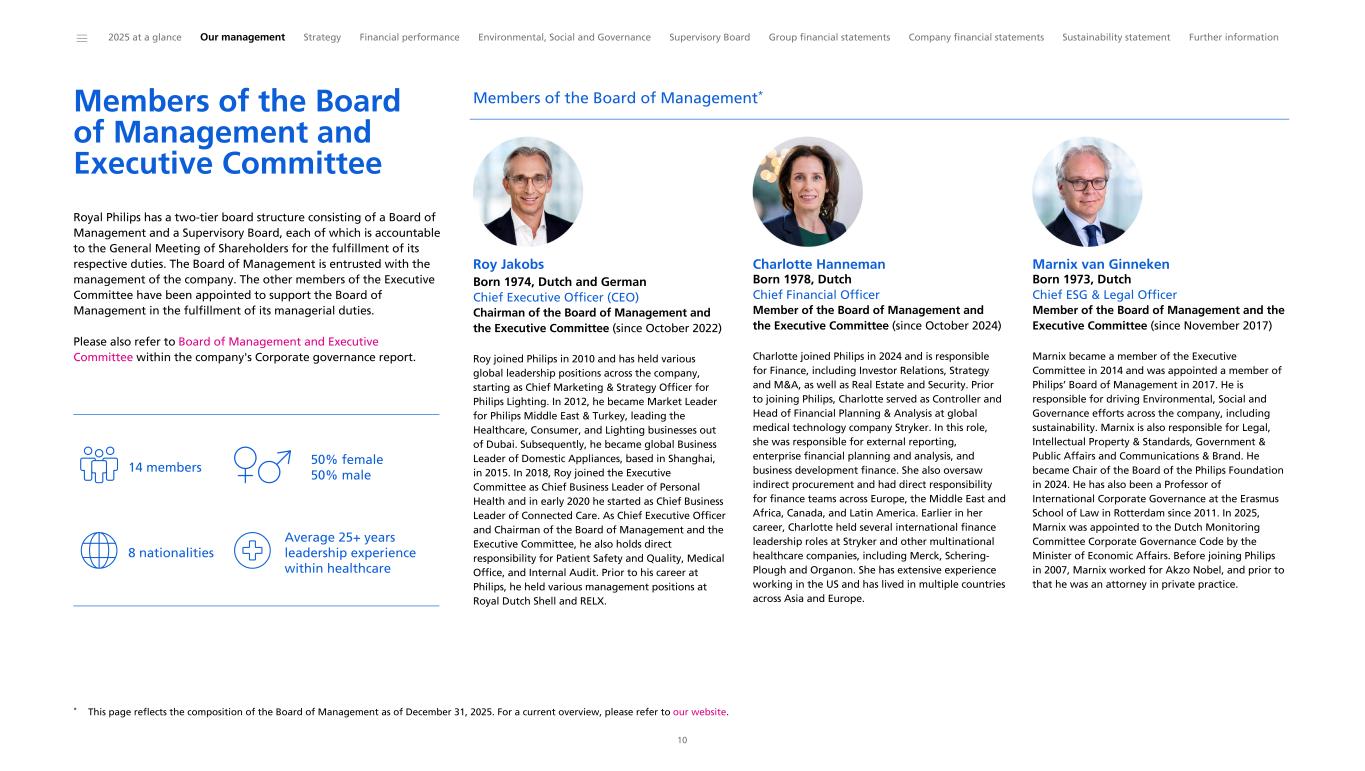 Members of the Board of Management and Executive Committee Royal Philips has a two-tier board structure consisting of a Board of Management and a Supervisory Board, each of which is accountable to the General Meeting of Shareholders for the fulfillment of its respective duties. The Board of Management is entrusted with the management of the company. The other members of the Executive Committee have been appointed to support the Board of Management in the fulfillment of its managerial duties. Please also refer to Board of Management and Executive Committee within the company's Corporate governance report. 14 members 50% female 50% male 8 nationalities Average 25+ years leadership experience within healthcare Members of the Board of Management* Roy Jakobs Born 1974, Dutch and German Chief Executive Officer (CEO) Chairman of the Board of Management and the Executive Committee (since October 2022) Roy joined Philips in 2010 and has held various global leadership positions across the company, starting as Chief Marketing & Strategy Officer for Philips Lighting. In 2012, he became Market Leader for Philips Middle East & Turkey, leading the Healthcare, Consumer, and Lighting businesses out of Dubai. Subsequently, he became global Business Leader of Domestic Appliances, based in Shanghai, in 2015. In 2018, Roy joined the Executive Committee as Chief Business Leader of Personal Health and in early 2020 he started as Chief Business Leader of Connected Care. As Chief Executive Officer and Chairman of the Board of Management and the Executive Committee, he also holds direct responsibility for Patient Safety and Quality, Medical Office, and Internal Audit. Prior to his career at Philips, he held various management positions at Royal Dutch Shell and RELX. Charlotte Hanneman Born 1978, Dutch Chief Financial Officer Member of the Board of Management and the Executive Committee (since October 2024) Charlotte joined Philips in 2024 and is responsible for Finance, including Investor Relations, Strategy and M&A, as well as Real Estate and Security. Prior to joining Philips, Charlotte served as Controller and Head of Financial Planning & Analysis at global medical technology company Stryker. In this role, she was responsible for external reporting, enterprise financial planning and analysis, and business development finance. She also oversaw indirect procurement and had direct responsibility for finance teams across Europe, the Middle East and Africa, Canada, and Latin America. Earlier in her career, Charlotte held several international finance leadership roles at Stryker and other multinational healthcare companies, including Merck, Schering- Plough and Organon. She has extensive experience working in the US and has lived in multiple countries across Asia and Europe. Marnix van Ginneken Born 1973, Dutch Chief ESG & Legal Officer Member of the Board of Management and the Executive Committee (since November 2017) Marnix became a member of the Executive Committee in 2014 and was appointed a member of Philips’ Board of Management in 2017. He is responsible for driving Environmental, Social and Governance efforts across the company, including sustainability. Marnix is also responsible for Legal, Intellectual Property & Standards, Government & Public Affairs and Communications & Brand. He became Chair of the Board of the Philips Foundation in 2024. He has also been a Professor of International Corporate Governance at the Erasmus School of Law in Rotterdam since 2011. In 2025, Marnix was appointed to the Dutch Monitoring Committee Corporate Governance Code by the Minister of Economic Affairs. Before joining Philips in 2007, Marnix worked for Akzo Nobel, and prior to that he was an attorney in private practice. ______ 2025 at a glance Our management Strategy Financial performance Environmental, Social and Governance Supervisory Board Group financial statements Company financial statements Sustainability statement Further information 10 * This page reflects the composition of the Board of Management as of December 31, 2025. For a current overview, please refer to our website.