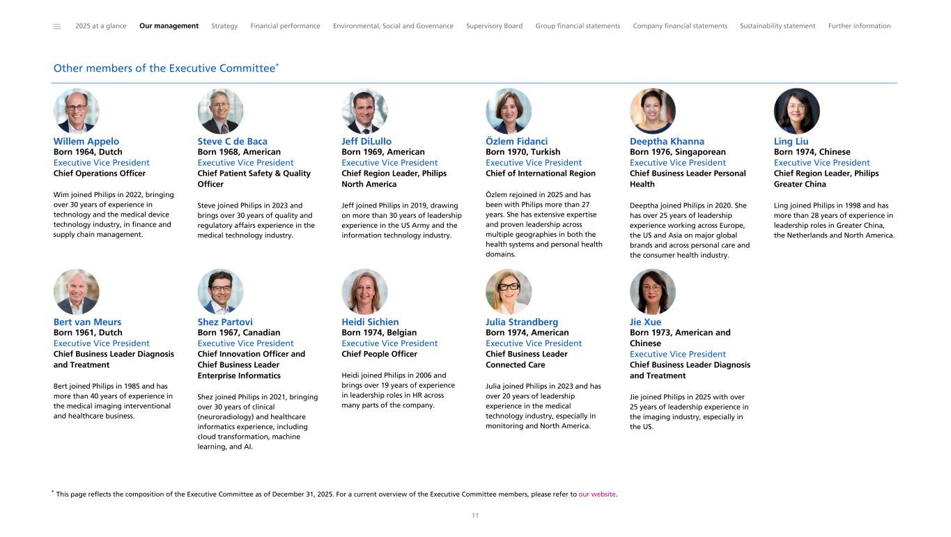 Other members of the Executive Committee* Willem Appelo Born 1964, Dutch Executive Vice President Chief Operations Officer Wim joined Philips in 2022, bringing over 30 years of experience in technology and the medical device technology industry, in finance and supply chain management. Steve C de Baca Born 1968, American Executive Vice President Chief Patient Safety & Quality Officer Steve joined Philips in 2023 and brings over 30 years of quality and regulatory affairs experience in the medical technology industry. Jeff DiLullo Born 1969, American Executive Vice President Chief Region Leader, Philips North America Jeff joined Philips in 2019, drawing on more than 30 years of leadership experience in the US Army and the information technology industry. Özlem Fidanci Born 1970, Turkish Executive Vice President Chief of International Region Özlem rejoined in 2025 and has been with Philips more than 27 years. She has extensive expertise and proven leadership across multiple geographies in both the health systems and personal health domains. Deeptha Khanna Born 1976, Singaporean Executive Vice President Chief Business Leader Personal Health Deeptha joined Philips in 2020. She has over 25 years of leadership experience working across Europe, the US and Asia on major global brands and across personal care and the consumer health industry. Ling Liu Born 1974, Chinese Executive Vice President Chief Region Leader, Philips Greater China Ling joined Philips in 1998 and has more than 28 years of experience in leadership roles in Greater China, the Netherlands and North America. Bert van Meurs Born 1961, Dutch Executive Vice President Chief Business Leader Diagnosis and Treatment Bert joined Philips in 1985 and has more than 40 years of experience in the medical imaging interventional and healthcare business. Shez Partovi Born 1967, Canadian Executive Vice President Chief Innovation Officer and Chief Business Leader Enterprise Informatics Shez joined Philips in 2021, bringing over 30 years of clinical (neuroradiology) and healthcare informatics experience, including cloud transformation, machine learning, and AI. Heidi Sichien Born 1974, Belgian Executive Vice President Chief People Officer Heidi joined Philips in 2006 and brings over 19 years of experience in leadership roles in HR across many parts of the company. Julia Strandberg Born 1974, American Executive Vice President Chief Business Leader Connected Care Julia joined Philips in 2023 and has over 20 years of leadership experience in the medical technology industry, especially in monitoring and North America. Jie Xue Born 1973, American and Chinese Executive Vice President Chief Business Leader Diagnosis and Treatment Jie joined Philips in 2025 with over 25 years of leadership experience in the imaging industry, especially in the US. ______ 2025 at a glance Our management Strategy Financial performance Environmental, Social and Governance Supervisory Board Group financial statements Company financial statements Sustainability statement Further information 11 * This page reflects the composition of the Executive Committee as of December 31, 2025. For a current overview of the Executive Committee members, please refer to our website.