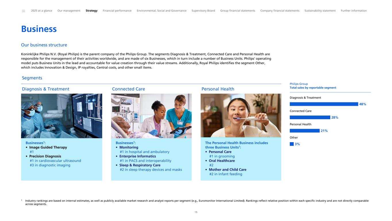 Business Our business structure Koninklijke Philips N.V. (Royal Philips) is the parent company of the Philips Group. The segments Diagnosis & Treatment, Connected Care and Personal Health are responsible for the management of their activities worldwide, and are made of six Businesses, which in turn include a number of Business Units. Philips' operating model puts Business Units in the lead and accountable for value creation through their value streams. Additionally, Royal Philips identifies the segment Other, which includes Innovation & Design, IP royalties, Central costs, and other small items.1 Segments Diagnosis & Treatment Connected Care Personal Health Businesses1: • Image Guided Therapy #1 • Precision Diagnosis #1 in cardiovascular ultrasound #3 in diagnostic imaging Businesses1: • Monitoring #1 in hospital and ambulatory • Enterprise Informatics #1 in PACS and interoperability • Sleep & Respiratory Care #2 in sleep therapy devices and masks The Personal Health Business includes three Business Units1: • Personal Care #1 in grooming • Oral Healthcare #2 • Mother and Child Care #2 in infant feeding Philips Group Total sales by reportable segment Diagnosis & Treatment 48% Connected Care 28% Personal Health 21% Other 3% ______ 2025 at a glance Our management Strategy Financial performance Environmental, Social and Governance Supervisory Board Group financial statements Company financial statements Sustainability statement Further information 15 1 Industry rankings are based on internal estimates, as well as publicly available market research and analyst reports per segment (e.g., Euromonitor International Limited). Rankings reflect relative position within each specific industry and are not directly comparable across segments.