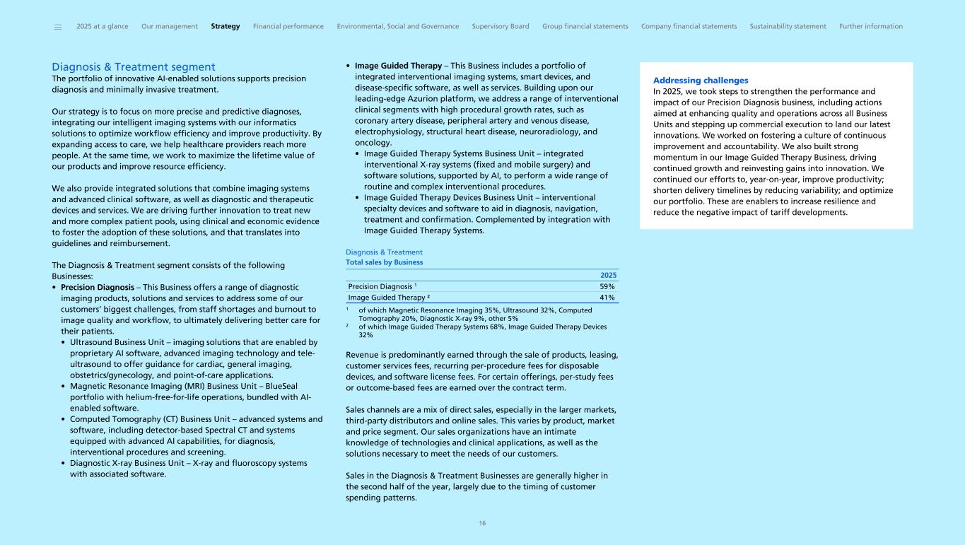 Diagnosis & Treatment segment The portfolio of innovative AI-enabled solutions supports precision diagnosis and minimally invasive treatment. Our strategy is to focus on more precise and predictive diagnoses, integrating our intelligent imaging systems with our informatics solutions to optimize workflow efficiency and improve productivity. By expanding access to care, we help healthcare providers reach more people. At the same time, we work to maximize the lifetime value of our products and improve resource efficiency. We also provide integrated solutions that combine imaging systems and advanced clinical software, as well as diagnostic and therapeutic devices and services. We are driving further innovation to treat new and more complex patient pools, using clinical and economic evidence to foster the adoption of these solutions, and that translates into guidelines and reimbursement. The Diagnosis & Treatment segment consists of the following Businesses: • Precision Diagnosis – This Business offers a range of diagnostic imaging products, solutions and services to address some of our customers’ biggest challenges, from staff shortages and burnout to image quality and workflow, to ultimately delivering better care for their patients. • Ultrasound Business Unit – imaging solutions that are enabled by proprietary AI software, advanced imaging technology and tele- ultrasound to offer guidance for cardiac, general imaging, obstetrics/gynecology, and point-of-care applications. • Magnetic Resonance Imaging (MRI) Business Unit – BlueSeal portfolio with helium-free-for-life operations, bundled with AI- enabled software. • Computed Tomography (CT) Business Unit – advanced systems and software, including detector-based Spectral CT and systems equipped with advanced AI capabilities, for diagnosis, interventional procedures and screening. • Diagnostic X-ray Business Unit – X-ray and fluoroscopy systems with associated software. • Image Guided Therapy – This Business includes a portfolio of integrated interventional imaging systems, smart devices, and disease-specific software, as well as services. Building upon our leading-edge Azurion platform, we address a range of interventional clinical segments with high procedural growth rates, such as coronary artery disease, peripheral artery and venous disease, electrophysiology, structural heart disease, neuroradiology, and oncology. • Image Guided Therapy Systems Business Unit – integrated interventional X-ray systems (fixed and mobile surgery) and software solutions, supported by AI, to perform a wide range of routine and complex interventional procedures. • Image Guided Therapy Devices Business Unit – interventional specialty devices and software to aid in diagnosis, navigation, treatment and confirmation. Complemented by integration with Image Guided Therapy Systems. Diagnosis & Treatment Total sales by Business Precision Diagnosis 1 59% Image Guided Therapy ² 41% 2025 1 of which Magnetic Resonance Imaging 35%, Ultrasound 32%, Computed Tomography 20%, Diagnostic X-ray 9%, other 5% 2 of which Image Guided Therapy Systems 68%, Image Guided Therapy Devices 32% Revenue is predominantly earned through the sale of products, leasing, customer services fees, recurring per-procedure fees for disposable devices, and software license fees. For certain offerings, per-study fees or outcome-based fees are earned over the contract term. Sales channels are a mix of direct sales, especially in the larger markets, third-party distributors and online sales. This varies by product, market and price segment. Our sales organizations have an intimate knowledge of technologies and clinical applications, as well as the solutions necessary to meet the needs of our customers. Sales in the Diagnosis & Treatment Businesses are generally higher in the second half of the year, largely due to the timing of customer spending patterns. Addressing challenges In 2025, we took steps to strengthen the performance and impact of our Precision Diagnosis business, including actions aimed at enhancing quality and operations across all Business Units and stepping up commercial execution to land our latest innovations. We worked on fostering a culture of continuous improvement and accountability. We also built strong momentum in our Image Guided Therapy Business, driving continued growth and reinvesting gains into innovation. We continued our efforts to, year-on-year, improve productivity; shorten delivery timelines by reducing variability; and optimize our portfolio. These are enablers to increase resilience and reduce the negative impact of tariff developments. ______ 2025 at a glance Our management Strategy Financial performance Environmental, Social and Governance Supervisory Board Group financial statements Company financial statements Sustainability statement Further information 16
