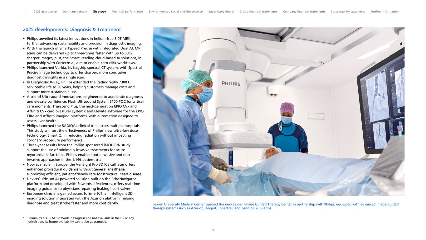 2025 developments: Diagnosis & Treatment • Philips unveiled its latest innovations in helium-free 3.0T MRI1, further advancing sustainability and precision in diagnostic imaging. • With the launch of SmartSpeed Precise with Integrated Dual AI, MR scans can be delivered up to three-times faster with up to 80% sharper images; plus, the Smart Reading cloud-based AI solutions, in partnership with Cortechs.ai, aim to enable zero-click workflows. • Philips launched Verida, its flagship spectral CT system, with Spectral Precise Image technology to offer sharper, more conclusive diagnostic insights in a single scan. • In Diagnostic X-Ray, Philips extended the Radiography 7300 C serviceable life to 20 years, helping customers manage costs and support more sustainable use. • A trio of Ultrasound innovations, engineered to accelerate diagnoses and elevate confidence: Flash Ultrasound System 5100 POC for critical care moments; Transcend Plus, the next-generation EPIQ CVx and Affiniti CVx cardiovascular systems; and Elevate software for the EPIQ Elite and Affiniti imaging platforms, with automation designed to assess liver health. • Philips launched the RADIQAL clinical trial across multiple hospitals. This study will test the effectiveness of Philips’ new ultra-low dose technology, SmartIQ, in reducing radiation without impacting coronary procedure performance. • Three-year results from the Philips-sponsored iMODERN study support the use of minimally invasive treatments for acute myocardial infarctions. Philips enabled both invasive and non- invasive approaches in the 1,146-patient trial. • Now available in Europe, the VeriSight Pro 3D ICE catheter offers enhanced procedural guidance without general anesthesia, supporting efficient, patient-friendly care for structural heart disease. • DeviceGuide, an AI-powered solution built on the EchoNavigator platform and developed with Edwards Lifesciences, offers real-time imaging guidance to physicians repairing leaking heart valves. • European clinicians gained access to SmartCT, an intelligent 3D imaging solution integrated with the Azurion platform, helping diagnose and treat stroke faster and more confidently. Leiden University Medical Center opened the new Leiden Image Guided Therapy Center in partnership with Philips, equipped with advanced image-guided therapy systems such as Azurion, AngioCT Spectral, and Zenition 70 C-arms. ______ 2025 at a glance Our management Strategy Financial performance Environmental, Social and Governance Supervisory Board Group financial statements Company financial statements Sustainability statement Further information 17 1 Helium-free 3.0T MRI is Work in Progress and not available in the US or any jurisdiction. Its future availability cannot be guaranteed.